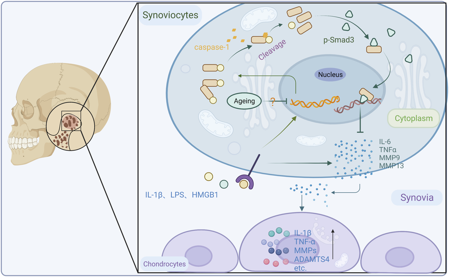 An illustration of intracellular IL-37 against arthritis in TMJ. In response to the stimulation of inflammatory factors, IL-37 is upregulated responsively in synovial cells in the form of precursors. Pro-IL-37 matures after cleavage by caspase-1 and translocates to the nucleus mediated by Smad3. This avoids excessive inflammatory responses in synovial cells and attenuates the release of IL-6, TNF-α, MMP9, and MMP13 and the resulting osteoarthritis.
