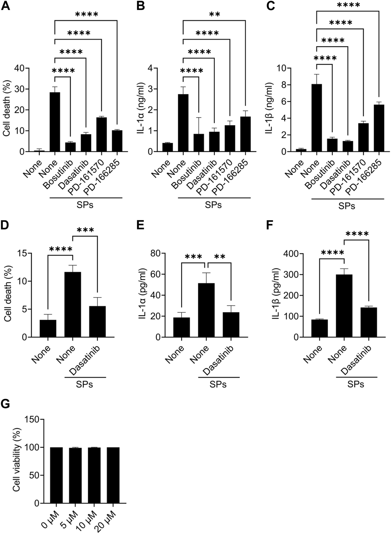 Dasatinib suppresses silica particle (SP)-induced cell death accompanied by interleukin-1 (IL-1) α release. (A–C) Bone marrow-derived macrophages (BMDMs) were primed with lipopolysaccharide (LPS) (200 ng/mL) for 6 h. The cells were then treated with 20 µM of bosutinib, dasatinib, PD-161570, or PD-166285 and were stimulated or not stimulated with SPs (1,500 nm in diameter, 300 μg/mL) for 2 h. (A) The cell death rate was determined by measuring lactate dehydrogenase (LDH) activity in the culture supernatant. (B,C) IL-1α and IL-1 beta (β) levels in the culture supernatants were measured using enzyme-linked immunosorbent assay (ELISA). (D–F) Phorbol 12-myristate 13-acetate-differentiated THP-1 cells were primed with LPS (50 ng/mL) for 16 h. The cells were then treated with dasatinib (20 µM) and were stimulated or not stimulated with SPs (1,500 nm in diameter, 500 μg/mL) for 4 h. (D) Cell death rate was determined by measuring LDH activity in the culture supernatant. (D,E) IL-1α and IL-1β levels in the culture supernatants were measured using ELISA. (G) BMDMs were treated with increasing doses of dasatinib (0–20 µM) for 12 h; thereafter, the cell death rate was determined by measuring LDH activity in the culture supernatant. The results are presented as the mean ± standard deviations (SD) of values from triplicate wells. **, p < 0.01; ***, p < 0.001; and ****, p < 0.0001.