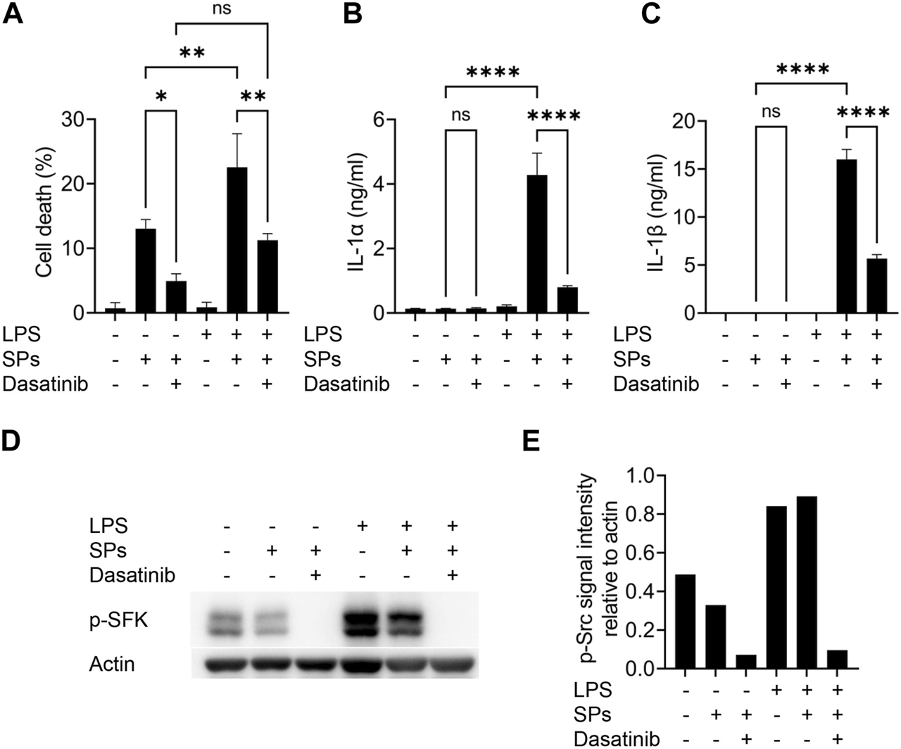 Lipopolysaccharide (LPS)-priming increases the levels of phosphorylated Src family kinases (p-SFKs) and enhances silica particle (SP)-induced pyroptosis. (A–E) Unprimed and LPS-primed bone marrow-derived macrophages (BMDMs) were treated with dasatinib (20 µM) and stimulated or not stimulated with SPs (1,500 nm in diameter, 300 μg/mL) for 2 h. (A) The cell death rate was determined by measuring lactate dehydrogenase (LDH) activity in the culture supernatants. (B,C) Interleukin-1 alpha (IL-1α) and IL-1 beta (β) levels in the culture supernatants were measured using enzyme-linked immunosorbent assay (ELISA). (D) Immunoblotting of p-SFKs in the cell extracts of BMDMs. (E) Quantification of p-SFK levels compared to actin control under conditions indicated in (D). The results are presented as the mean ± SD of values from triplicate wells. *, p < 0.05; **, p < 0.01; and ****, p < 0.0001; ns, not significant.