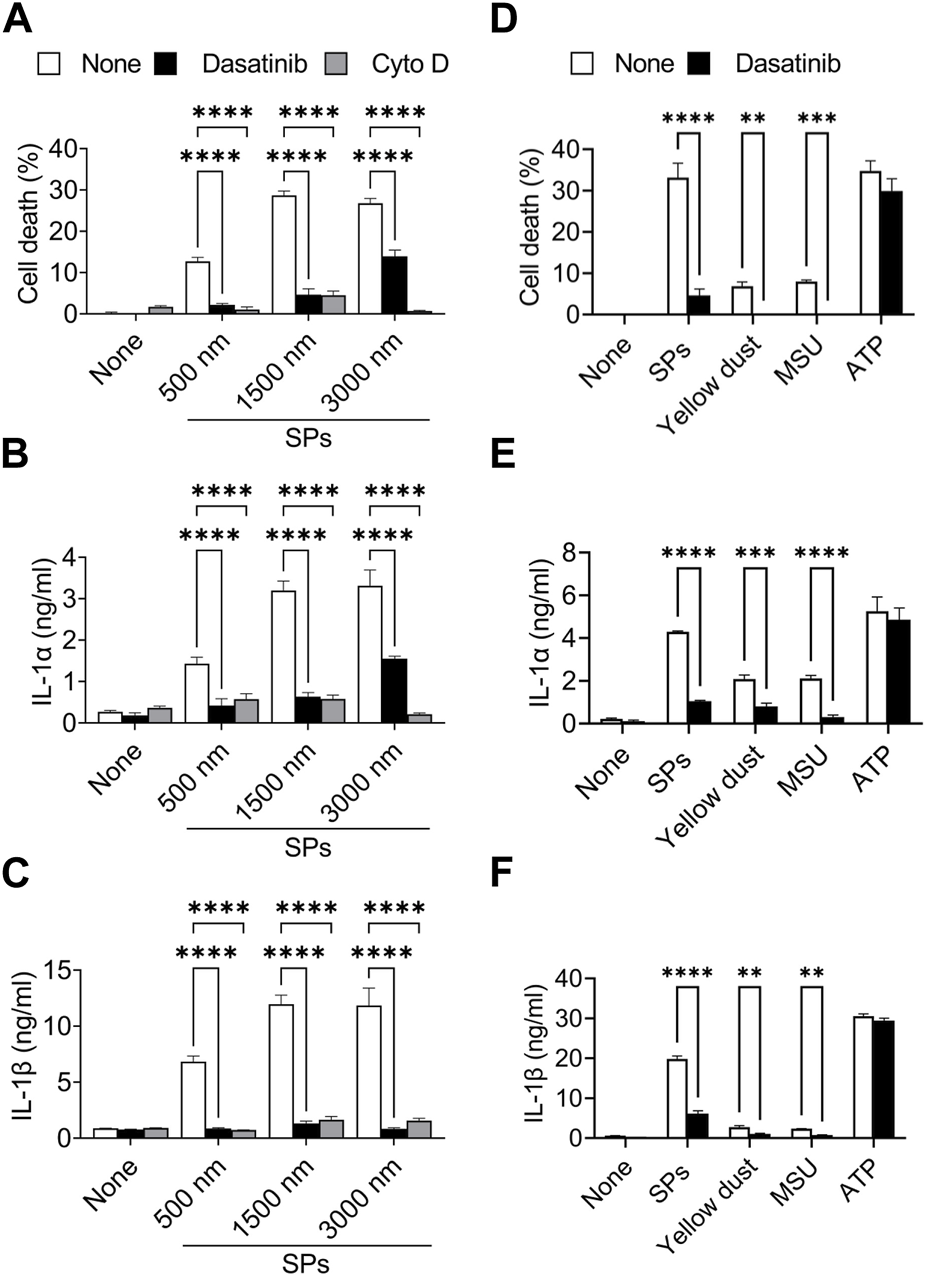Dasatinib suppresses pyroptosis induced by particulates of various sizes or materials. (A–C) Primed bone marrow-derived macrophages (BMDMs) were treated with 20 µM dasatinib or cytochalasin D (Cyto D) and stimulated or not stimulated with silica particles (SPs) (500, 1,500, or 3,000 nm in diameter, 300 μg/mL) for 2 h. (A) The cell death rate was determined by measuring lactate dehydrogenase (LDH) activity in the culture supernatants. (B,C) Interleukin-1 alpha (IL-1α) and IL-1 beta (β) levels in the culture supernatants were measured using enzyme-linked immunosorbent assay (ELISA). (D–F) The primed BMDMs were treated with dasatinib (20 µM) and stimulated or not stimulated with SPs (1,500 nm in diameter, 300 μg/mL), yellow dust (500 μg/mL), monosodium urate (MSU) (300 μg/mL) or adenosine triphosphate (ATP) (3 mM) for 2 h. (D) The cell death rate was determined by measuring LDH activity in the culture supernatants. (E,F) IL-1α and IL-1β levels in the culture supernatants were measured using ELISA. The results are presented as the mean ± SD of values from triplicate wells. **, p < 0.01; ***, p < 0.001; and ****, p < 0.0001.