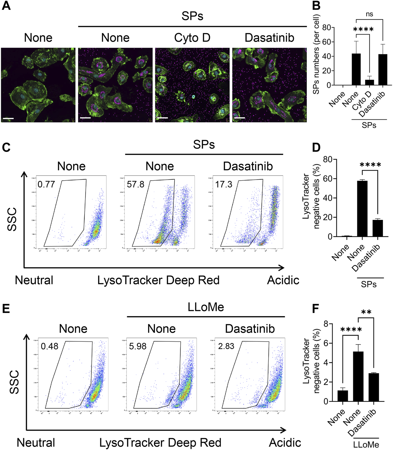Dasatinib suppresses phagolysosomal and lysosomal dysfunction induced by silica particle (SP) and L-leucyl-L-leucine methyl ester (LLoMe) stimulation. (A) Primed bone marrow-derived macrophages (BMDMs) were treated with 20 µM cytochalasin D (Cyto D) or dasatinib and stimulated or not stimulated with fluorescent SPs (1,500 nm in diameter, 20 μg/mL; magenta) for 2 h. Actin (green) and nuclei (cyan) were stained with phalloidin and DRAQ5, respectively. Scale bar; 30 µm. (B) Numbers of SPs in BMDMs. The results are presented as the mean ± SD of values from 74 cells. (C) Flow cytometric analysis of the primed BMDMs treated with dasatinib (20 µM) and stimulated or not stimulated with SPs (1,500 nm in diameter, 300 μg/mL) for 2 h. The cells were stained with the fluorescent dye LysoTracker Deep Red. The data are representative of three independent experiments. (D) Percentages of the LysoTracker Deep Red-negative population were calculated. The results are presented as the mean ± SD of values from triplicate wells. (E) Flow cytometric analysis of primed BMDMs treated with dasatinib (20 µM) and stimulated or not stimulated with LLoMe (0.5 µM) for 3 h. The cells were stained with the fluorescent dye LysoTracker Deep Red. The data are representative of three independent experiments. (F) Percentages of the LysoTracker Deep Red-negative population were calculated. The results are presented as the mean ± SD of values from triplicate wells. **, p < 0.01, and ****, p < 0.0001; ns, not significant.