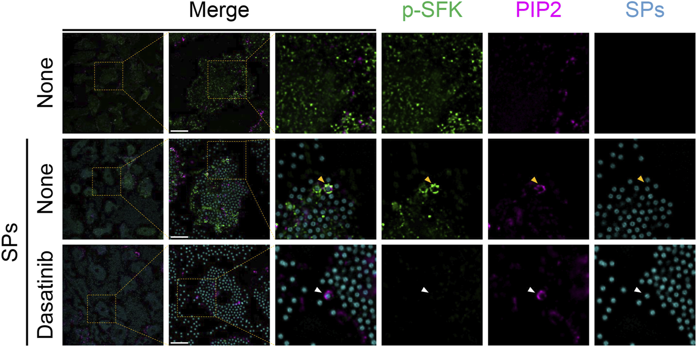 Based on the findings of the present study, SFKs potentially mediate the dysfunction of SP-containing phagolysosomes. SFKs, including Src, Fyn, Lyn, and Yes, are recruited to actin-rich phagocytic cups during Fcγ receptor-mediated phagocytosis (Majeed et al., 2001). Therefore, we performed immunofluorescence analysis of BMDMs to investigate the spatio-temporal activity of SFK after the cells phagocytose particulates. In the initial stages of phagocytosis, PIP2 accumulates and initiates actin polymerization to extend the pseudopod and engulf the target (e.g., particulates) (Scott et al., 2005). Without SP stimulation, both PIP2 and p-SFKs were distributed throughout the cytoplasm of LPS-primed BMDMs (Figure 5). SPs were surrounded by PIP2 in BMDMs 15 min after SP stimulation. Furthermore, p-SFK accumulated around some PIP2-surrounded SPs. Dasatinib abolished p-SFK signals but did not affect the intensity or distribution of the PIP2 signals. These observations suggest that p-SFKs accumulate around the phagosomes engulfing particulates during the initial stages of phagocytosis.