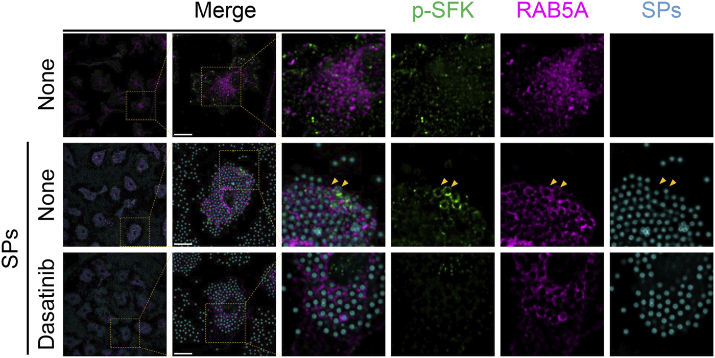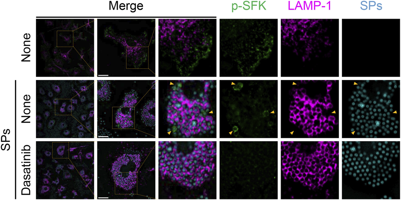 In the present study, p-SFKs accumulated around SPs surrounded by RAB5A. However, LAMP-1 levels around SPs surrounded by p-SFKs were negligible. Therefore, it is presumed that dasatinib-targeted SFKs act on the membranes of particulate-containing phagosomes only at the early stage of maturation; however, whether p-SFKs are dispersed, dephosphorylated, or degraded after the maturation of phagosomes into phagolysosomes remains unclear. Alternatively, p-SFK-accumulated phagosomes are vulnerable and immediately degrade after fusion with lysosomes. In our study, p-SFK-accumulated phagolysosomes were not detected under the experimental conditions. Therefore, further studies are warranted on p-SFK recruitment after engulfing particulates and their subsequent fate. These studies will help explain why p-SFKs are selectively recruited to certain phagosomes.