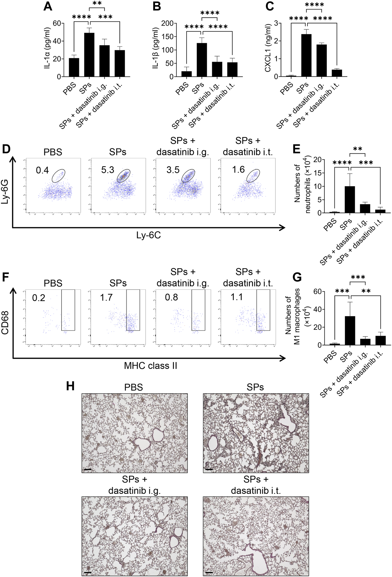 Dasatinib treatment attenuates SP-induced acute pneumonia. (A–C) Bronchoalveolar lavage (BAL) fluid was collected from mice 12 h after intratracheal SP administration (i.t.; 100 mg/kg) with or without the intragastric (i.g.; 30 mg/kg) and intratracheal (10 mg/kg) administration of dasatinib. Interleukin-1 alpha (IL-1α), IL-1 beta (β), and chemokine (C-X-C motif) ligand 1 (CXCL1) levels in the BAL fluid were measured using enzyme-linked immunosorbent assay (ELISA). (D) Neutrophils in mouse lungs 12 h after intratracheal SP administration were counted using flow cytometry. The numbers in the plots indicate the percentage of neutrophils in total leukocytes. (E) The total number of neutrophils. (F) M1 macrophages in mouse lungs 12 h after intratracheal SP administration were counted using flow cytometry. The numbers in the plots indicate the percentage of M1 macrophages in total leukocytes. (G) The total number of M1 macrophages. (H) Representative images of hematoxylin and eosin staining of mouse lungs collected 12 h after intratracheal SP administration. Scale bar; 100 μm. The results are presented as mean ± SD (n = 5, each group). **, p < 0.01; ***, p < 0.001; and ****, p < 0.0001.