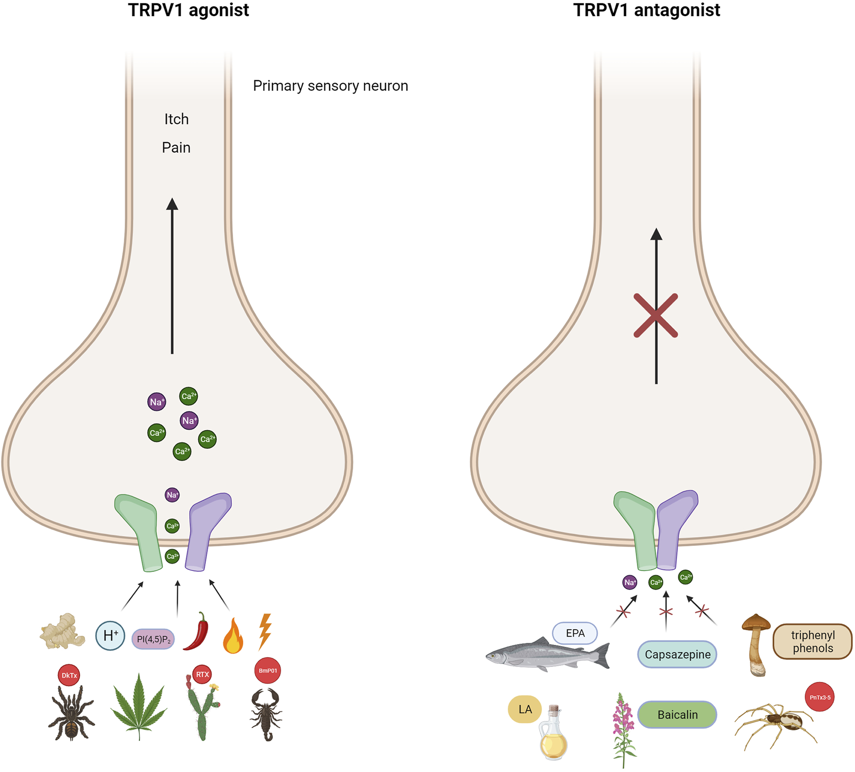 TRPV1 channel as polymodal receptor. TRPV1 channels in mammals can be activated by a range of ligands including heat above 42°C, capsaicin (the compound responsible for spicy in peppers), voltage, endogenous stimuli such as protons, lipids PI(4,5)P2, ginger (gingerol), Cannabis sativa (endocannabinoids), and plant and animal toxins. Indeed, resiniferatoxin (RTX) from the native Moroccan species Euphorbia resinifera, the native Nigerian species Einhorbia possonii, DkTx peptide toxins from the terrestrial tiger tarantula (Ornithoctonus huwena), and BmP01 from the Chinese scorpion (Mesobuthus martensii). This activation makes the flow of cations more permeable, causing pain and itching. Antagonists of the TRPV1 channel on the other hand, cause the channel to close, blocking its activity. Capsazepine is a synthetic compound structurally similar to capsaicin and is a classic antagonist of TRPV1 channels. Fascinating antagonists of natural origin have also been discovered, such as eicosapentaenoic acid (EPA), derived from fish, and linoleic acid (LA), mainly present in oils, both of which are fatty acids. The group of flavonoids includes baicalin from the plant Scutellaria baicalensis and triprenyl phenols (albaconol, grifolina, neogrifolina) from the fungal genus Albatrellus spp. Additionally, the peptide toxin PnTx3-5 from the banana spider Phoneutria nigrivente is also a member of this group. The broad range of TRPV1 modulators allows for the development of new analgesics which can act as either TRPV1 agonists or antagonists (Created with BioRender.com)
