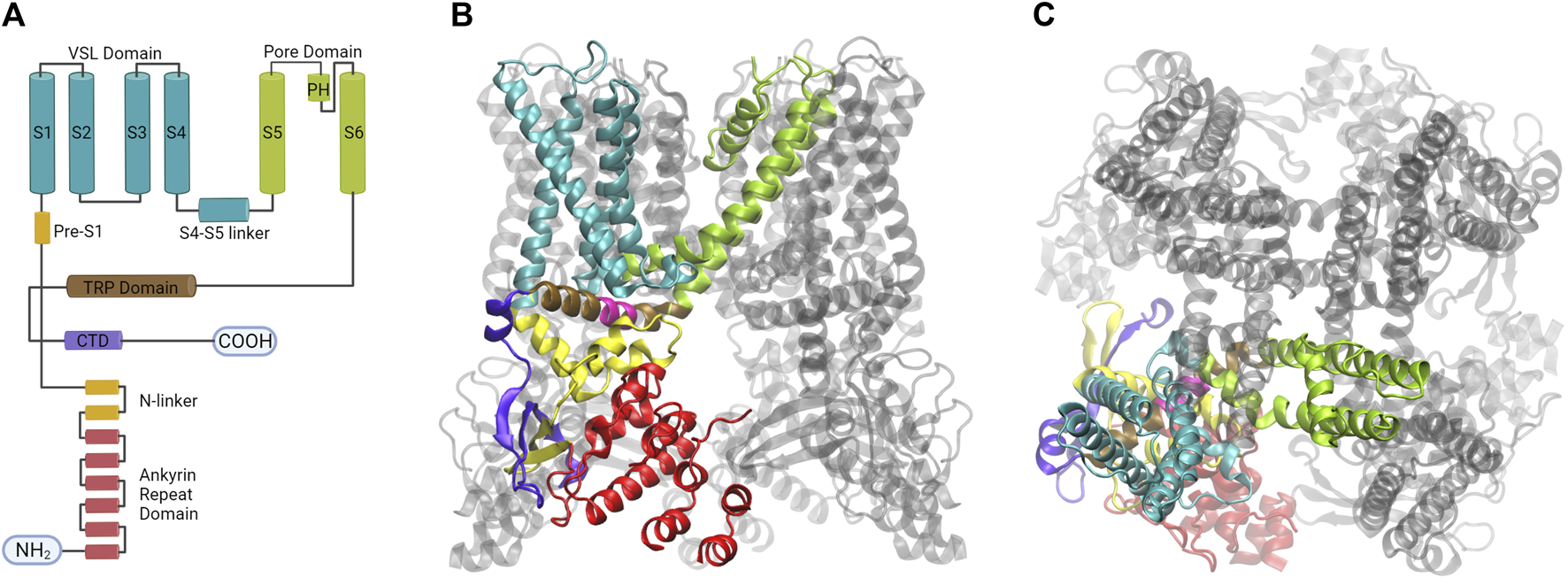 The homotetramer of the TRPV1 channel is organized by a quadruple-symmetric architecture. (A) Diagram illustrating the topology of the major structural domains found in a subunit of the TRPV1 channel. Each domain is color-coded: the voltage sensing like domain (cyan), the pore domain (lime), the TRP domain (brown), the ankyrin repeat domains (red), and the CTD domain (violet). These colors correspond to the colors of the ribbon diagrams shown to the right. (B) The image displays the tetrameric structure of the TRPV1 channel with one subunit highlighted from a lateral view (C) The architecture of the fourfold symmetry Is shown from a top view, revealing the interaction between S1- S4 and PD in a domain-swapped arrangement (Created with BioRender.com, Protein Data Bank: 7LPD).