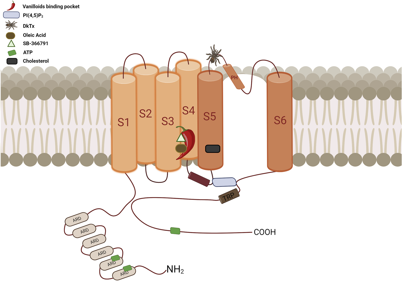 Diagrammatic overview of the TRPV1 channel’s topological arrangement and key binding sites location. The vanilloid binding site, represented by a chili pepper, is located between segments S3, S4, the S4-S5 linker, and the PD of the adjacent subunit. This site accommodates a variety of ligands such as CAP, RTX, CPZ, OA, PI, among others, all of which interact with at least one of these residues: Y512, S513, E571, T550, T551, and R557. The cholesterol interaction site is located between residues 579 to 586 at S5, specifically at the CRAC motif. ATP has three interaction sites: ANKR1, ANKR2 and the distal C-terminus. The binding site for PI(4,5)P2 is located between S3 and the S4-S5 linker, above the TRP domain. It interacts with residues R557 in the S4 segment, E570, R575, and R579 in the S4-S5 linker, and residue K694 of the TRP domain of an adjacent subunit. The DkTx site, represented by a spider, binds to the channel on the extracellular side, specifically in the outer pore region. It contacts residues at the top of the pore helix from one subunit and the outer pore loop of the adjacent subunit, interacting with residues I599, F649, A657, and F659 (Created with BioRender.com).