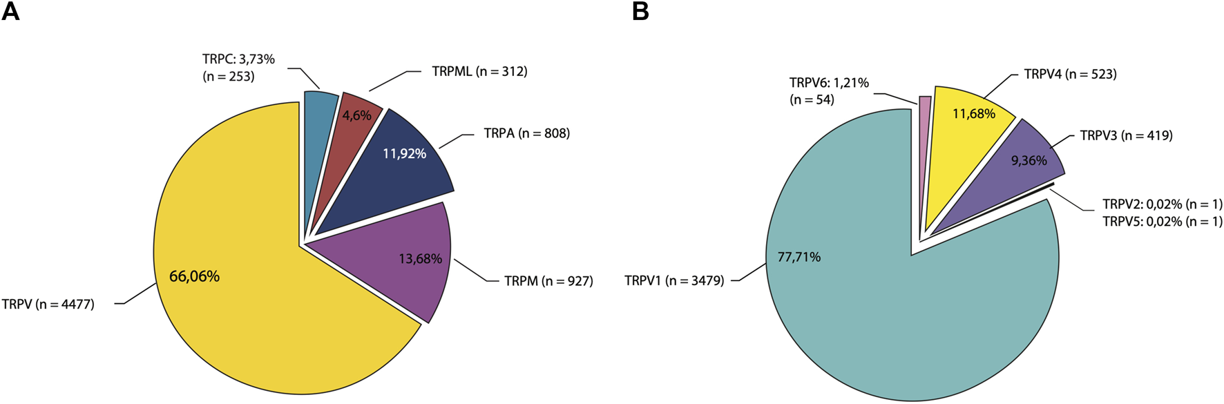 Temperature sensing is made possible through the expression of a subset of channel receptors that belong to the transient receptor potential (TRP) ion channel superfamily. These receptors are known as thermoTRP channels. The origin of the name TRP comes from the discoveries made by Cosens and Manning, (1969), with a mutant strain of Drosophila melanogaster that shows an abnormal transient response to light instead of a sustained receptor potential during light exposure that is normally observed in the wild phenotype, then the mutant was named trp (transient receptor potential). In 1989 the gene responsible for this trp phenotype was cloned in D. melanogaster and was suggested that may function as a channel or receptor (Montell and Rubin, 1989). Homologues of these channels were subsequently identified in several taxa, and currently 28 members of the TRP channel superfamily have been identified, grouped into eight subfamilies: TRPC (“canonical”), TRPA (“ankyrin”), TRPV (“vanilloid”), TRPM (“melastatin”), TRPS (“soromelastatin”), TRPML (“mucolipin”), TRPP (“polycystin”) and TRPN (“Non-mecano-potential or NOMP-C”) (Himmel et al., 2021). Most TRP channels function as polymodal receptors that detect and transduce physical and chemical signals such as pressure, pH, temperature, lipids, toxins, chemical ligands, and other stimuli. Functional TRP channels are tetramers formed by subunits with a topology of six transmembrane segments with the pore domain between the S5-S6 segments, and the N- and C-terminal domains facing intracellularly (Gees et al., 2012). A subset of TRP channels belonging to TRPV (1–4), TRPM (2, 3, 4, 5, 8), TRPA1 and TRPC5, are thermally gated and respond to temperatures ranging from noxious cold (<15°C) to noxious heat (>42°C) and are classified as “thermoTRPs” (Zimmermann et al., 2011; Ferrandiz-Huertas et al., 2014; Song et al., 2016). The TRPV1 known for its involvement in nociception and pain, is a highly-researched member of thermoTRP channels. Biomedical studies aim to identify suitable molecules for pain relief therapeutic intervention, with particular focus on this ion channel.