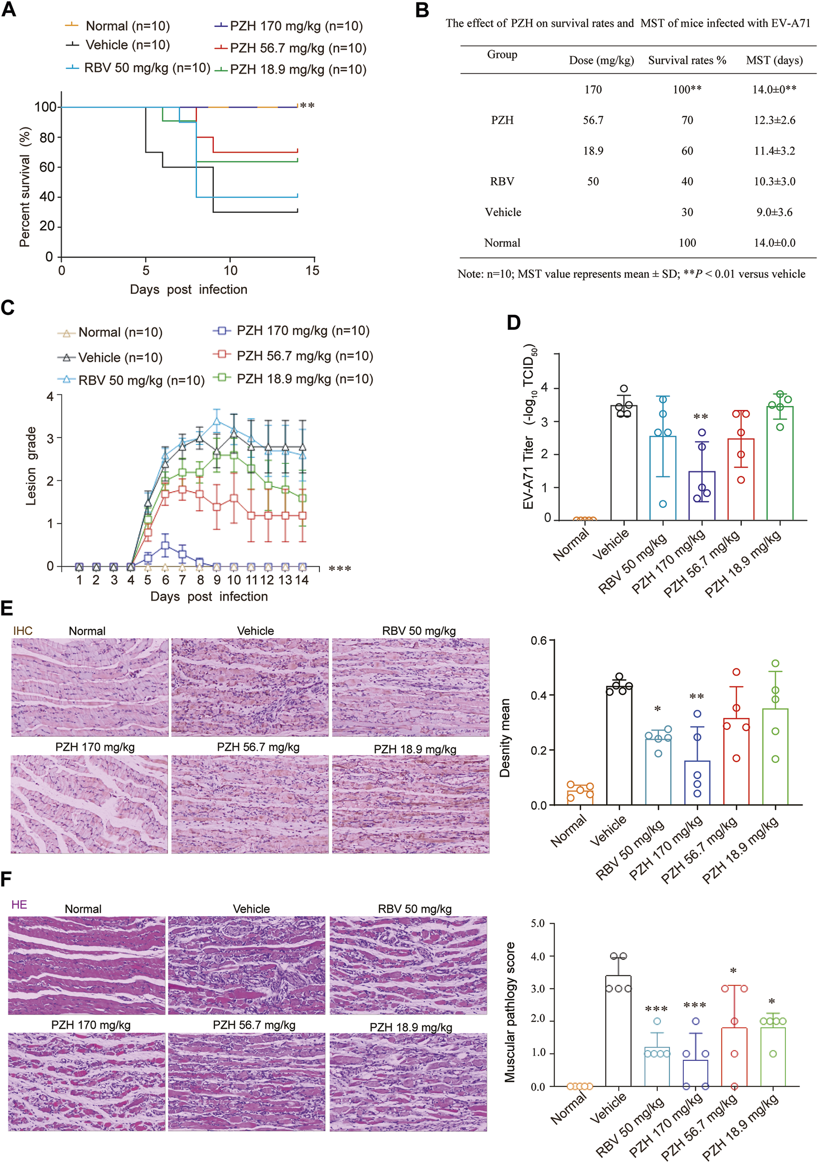 For in vivo assessment of viral propagation and histopathology in the EV-A71-H-MA infected mice, the protocol for drugs treatment and EV-A71-H-MA infection was the same as described above. 11-Day-old ICR mice were infected with EV-A71-H-MA by intraperitional inoculation at a dose of 20000 TCID50 for 1 h. Following the initial infection, the infected mice received intragastric administration of PZH at three different doses: 170, 56.7, and 18.9 mg/kg. Additionally, the mice were intraperitoneally injected with RBV at a dose of 50 mg/kg once daily. Mice were dissected at 5 days post-infection. Muscle tissues were fixed in 10% neutral buffered formalin for subsequent hematoxylin and eosin (H&E) staining, and immunohistochemical (IHC) analyses using an antibody against EV-A71 VP1 (GeneTex, CA, United States). Muscle tissues from other mice were frozen for virus titer assays.