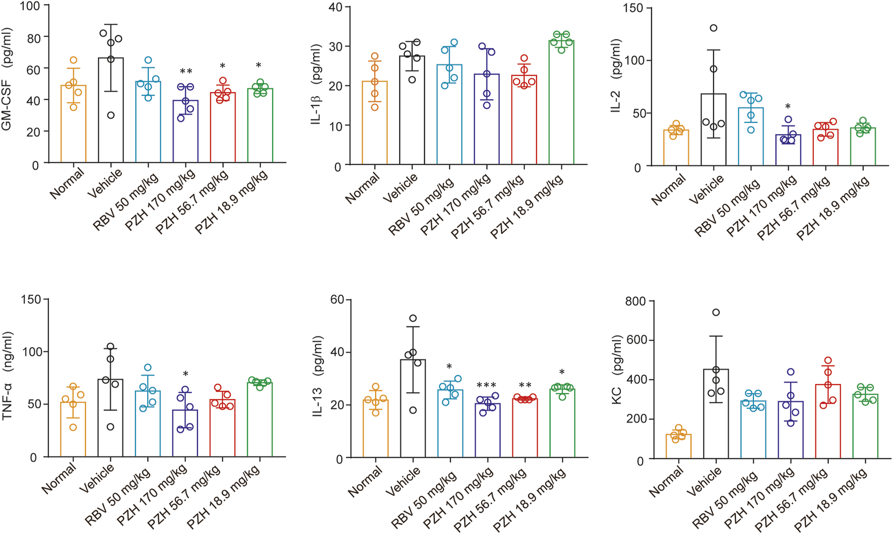 Due to the significantly higher levels of EV-A71 titers detected in hind-limb muscle tissues compared to other tissues (Wang et al., 2013), the expressions of EV-A71 VP1 protein and viral yields in hind limb muscle tissue were examined. The results demonstrated that PZH treatment exhibited a dose-dependent decrease in yields of EV-A71 in infected muscles (Figure 2D). And it also inhibited the expression of EV-A71 VP1 protein in hind-limb muscle tissue (Figure 2E). In line with the decrease of viral yields, PZH administration led to an improvement in muscle pathological manifestations, as evidenced by H&E staining of muscle tissue sections (Figure 2F). Considering that PZH treatment alleviates the pathological injury in mouse muscle tissue, we further examined the changes of cytokines in mice serum, with or without PZH treatments. As shown in Figure 3, PZH dose-dependently downregulated the expressions of granulocyte-macrophage colony-stimulating factor (GM-CSF), interleukin-1 beta (IL-1β), interleukin-2 (IL-2), tumour necrosis factor alpha (TNF-α), interleukin-13 (IL-13), and keratinocytes (KC). Particularly, high-dose (170 mg/kg) PZH treatment exhibited comparable or even more potent cytokine regulatory efficacy than RBV. These results indicated that PZH might exert its anti-EV-A71 activity by regulating cytokines release, which evoked us to carry out further mechanism study.