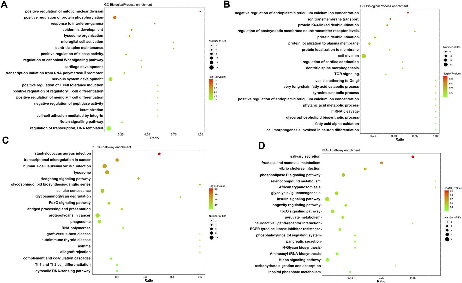 Gene ontology annotation and KEGG pathway analysis of EV-A71-infected RD cells after PZH treatment. (A) GO analysis of upregulated proteins. (B) GO analysis of downregulated proteins. (C) KEGG analysis of upregulated proteins. (D) KEGG analysis of downregulated proteins.