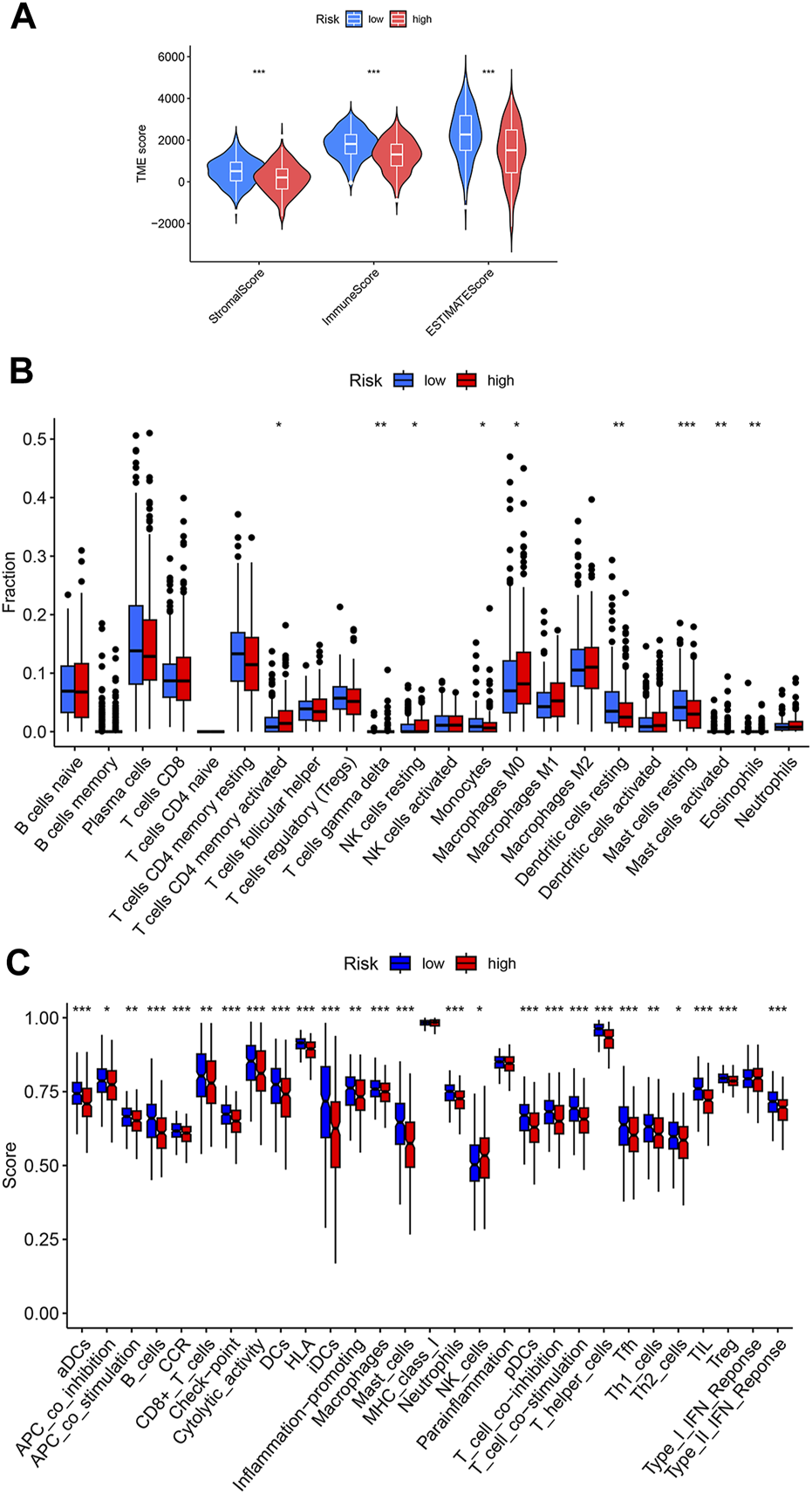 Different immune cell infiltration levels in the high- and low-risk LUADs. (A) Violin plots showing the differences of stromal and immune scores between the high-risk and low-risk groups. (B) Differences in infiltration degrees of 22 immune cell types in the tumor microenvironment of high- and low-risk LUADs. (C) Differences in diverse immune functions activities in the tumor microenvironment of high- and low-risk LUADs. *, p < 0.05; **, p < 0.01; ***, p < 0.001.