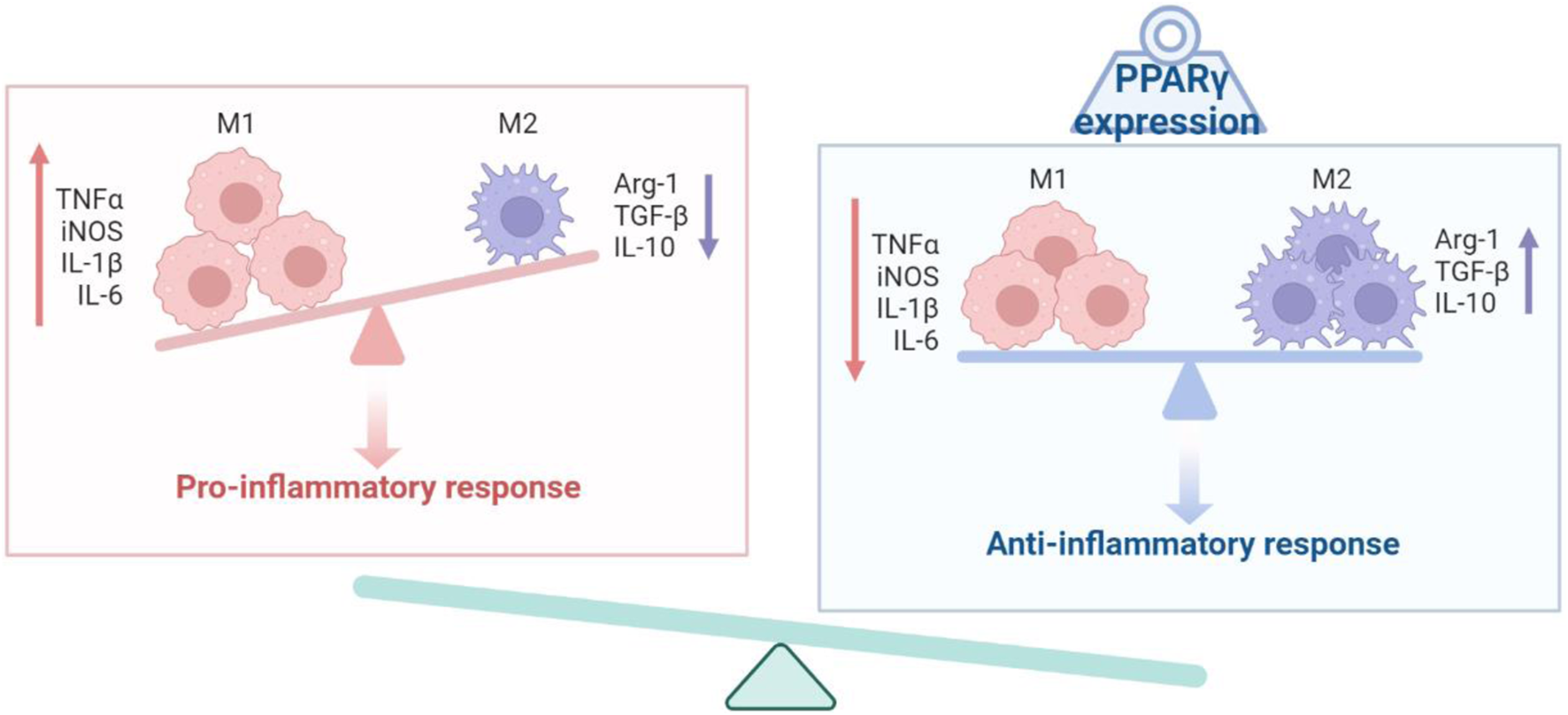 Modulating PPARγ in macrophages holds significant therapeutic promise for various diseases. Which are involved in anti-inflammatory, metabolic disorders, immunomodulation and tissue repair and regeneration. Activating PPARγ can shift macrophage polarization towards the anti-inflammatory M2 phenotype, dampening excessive inflammation and promoting tissue repair (Eming et al., 2017; Nelson et al., 2018; Abdalla et al., 2020; Wculek et al., 2022). This approach shows potential in treating chronic inflammatory conditions like rheumatoid arthritis, inflammatory bowel disease, and metabolic disorders such as diabetes and dyslipidemia (Gu et al., 2014; Jalil et al., 2014; Baillie et al., 2017; Na et al., 2019; Cataldi et al., 2021). Additionally, PPARγ activation can modulate macrophage phagocytosis, antigen presentation, and cytokine production, influencing the overall immune response (Yu et al., 2016; Ciavarella et al., 2020; Mierzejewski et al., 2022). Harnessing these immunomodulatory effects may hold potential in immunotherapeutic strategies and cancer treatment, as macrophages play a critical role in tumor microenvironments.