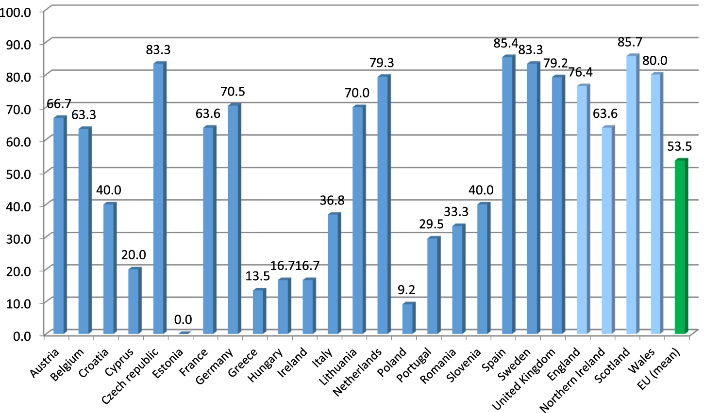 Out of the 26 EU countries from which the responses to the benchmarking survey were collected, polypharmacy management activities or programs for the elderly were reported by all but two countries. On average, more than half of the respondents (53.5%) from the EU countries reported availability of such programs. Due to fulfilling the predefined criterion of programs reported by <10% of the respondents, three EU countries, i.e., Bulgaria, Estonia and Poland, were deemed to be ‘no intervention courtiers’, providing availability of programs in 0%, 0% and 9.2% of their reports, respectively. On the other hand, as many as 14 EU countries reached the level of 50% or more of the respondents reporting availability of polypharmacy management programs for the elderly (these being Austria, Belgium, Czech Republic, Denmark, Finland, France, Germany, Latvia, Lithuania, Netherlands, Slovakia, Spain, Sweden, and the United Kingdom). Among them, seven countries reached a level of 75% or more of the respondents reporting availability of such programs. For detailed distribution of percentages of the respondents reporting availability of polypharmacy management programs for the elderly in their countries, see Figure 2.