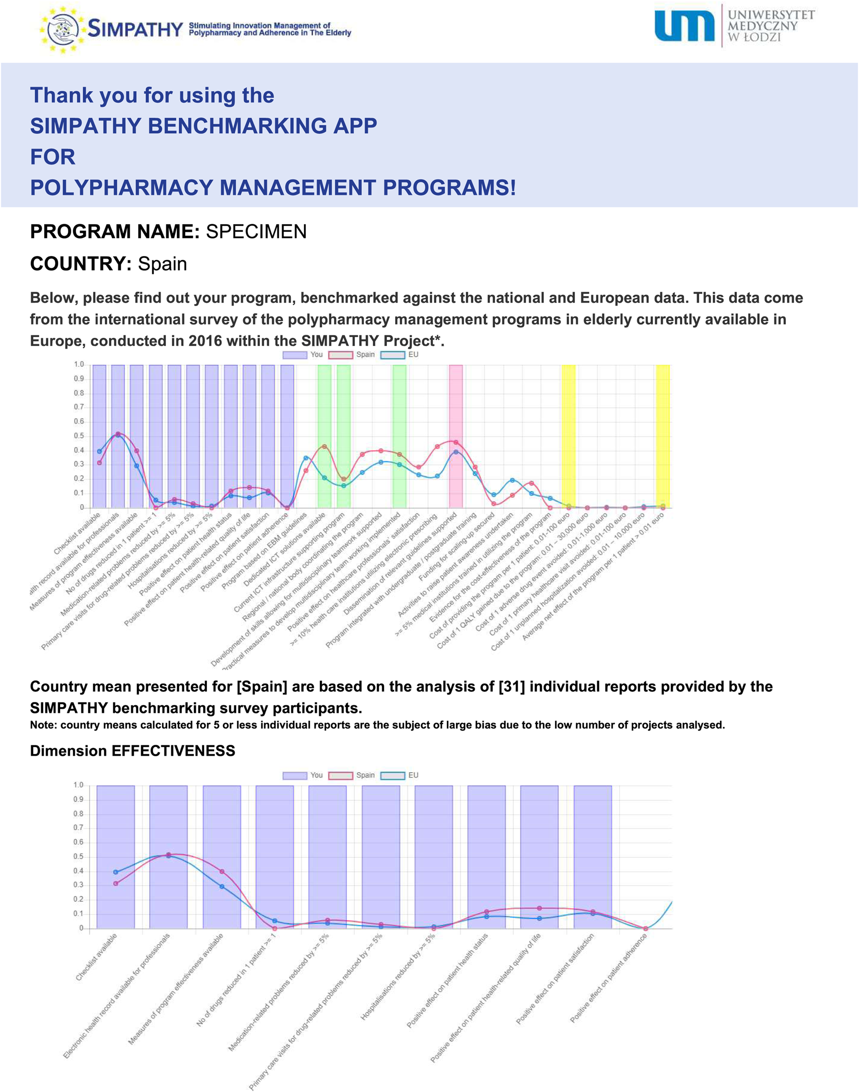 After the application questionnaire is filled in, a graphical report is produced automatically, along with its printable version (Figure 3). In this report, characteristics of an individual program of polypharmacy management in the elderly are provided with reference to four dimensions, i.e., effectiveness, applicability, scalability and cost-effectiveness. It is also benchmarked to the mean national and European data coming from the SIMPATHY benchmarking survey. Moreover, for the sake of transparency, additional information is provided on the number of responses collected in the benchmarking survey for the country concerned.