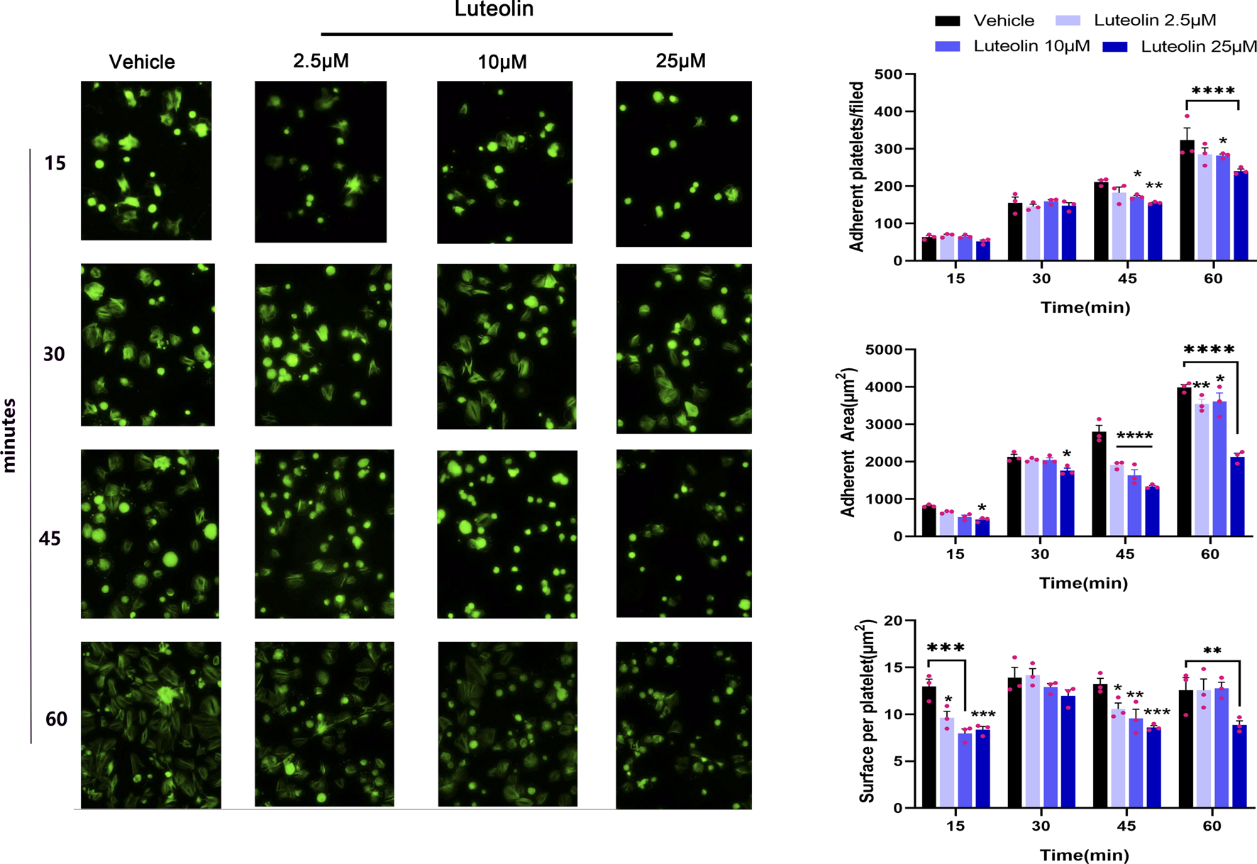 Exposure of the collagen matrix at the vascular injury and platelet adhesion to the collagen surface initiates thrombosis (Sun et al., 2022). This adhesion step mainly involves integrin a2β1 and GPVI. We investigated the effect of luteolin on platelet static adhesion to the collagen surface by immunofluorescence. As shown in Figure 3, the number of adherent platelets increased with time. Luteolin 10 and 25 µM significantly decreased platelet adherence at 45 and 60 min compared with the vehicle. Compared with the vehicle, luteolin 2.5 and 10 µM decreased the surface per platelet at 15 and 45 min, while luteolin 25 µM decreased the surface per platelet at 15, 45, and 60 min. The adherent area increased in all groups with time. Luteolin 25 µM decreased the adherent area at 15, 30, 45, and 60 min compared with the vehicle, while luteolin at 2.5 and 10 µM slightly decreased the adherent area at 60 min. Therefore, these results suggest that increasing luteolin concentration had a more obvious effect on cell adhesion.