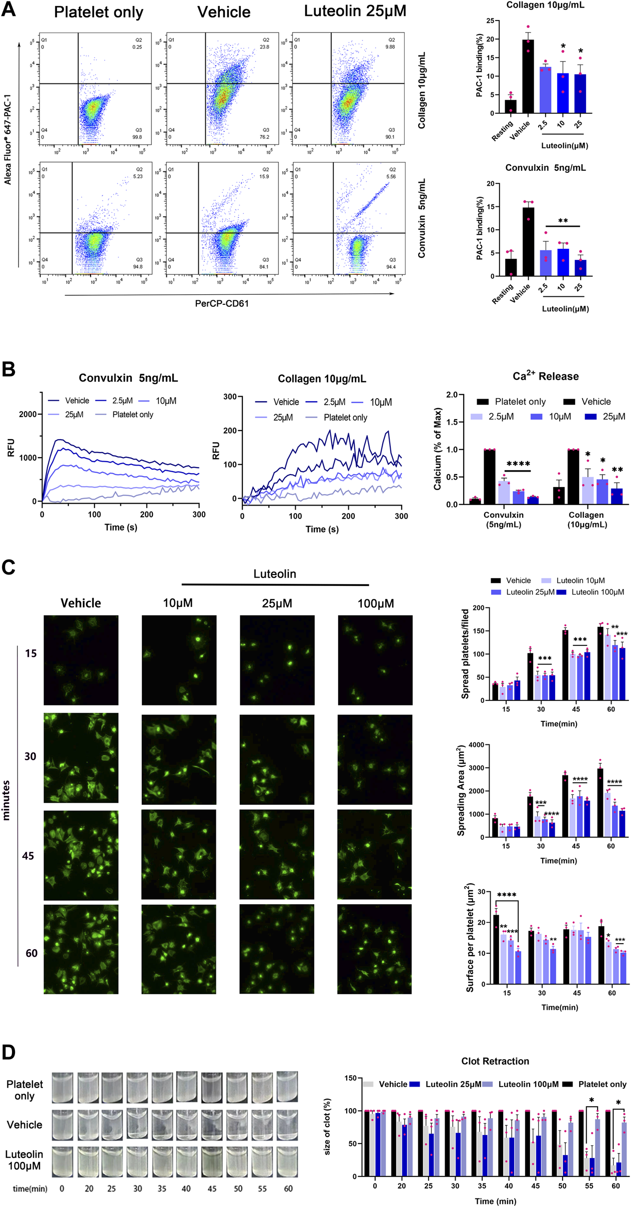 Effect of luteolin on integrin αIIbβ3-mediated “inside-out” and “outside-in” activation in human platelet. (A) Washed platelets (WPs) were incubated with DMSO or luteolin at 37°C for 10 min CaCl2 (1 mM) and collagen (10 μg/mL) or convulxin (5 ng/mL) were added to stimulate the WPs. The expression of the PAC-1 protein on the platelet surface was analyzed using flow cytometry. n = 3. Statistical analysis of PAC-1 cells was calculated by the FlowJo software. (B) Convulxin (5 ng/mL) and collagen (10 μg/mL) induced platelets intracellular calcium release were recorded and traced using a Fluorescence microplate reader at ex/em = 480/530 nm (left panel). n = 3. (C) The WPs were spread on 25 μg/mL of fibrinogen-coated slides Magnification ×40. n = 3. (D) WPs were incubated with 1 mM CaCl2 with 0.1 U/mL thrombin at 37°C and photographed every 5 min to observe clot retraction, n = 3. Data are expressed as mean ± SEM, analyzed with ANOVA followed by Dunnett’s test. Compared with the vehicle group, *p < 0.05, **p < 0.01, ***p < 0.001, ****p < 0.0001.
