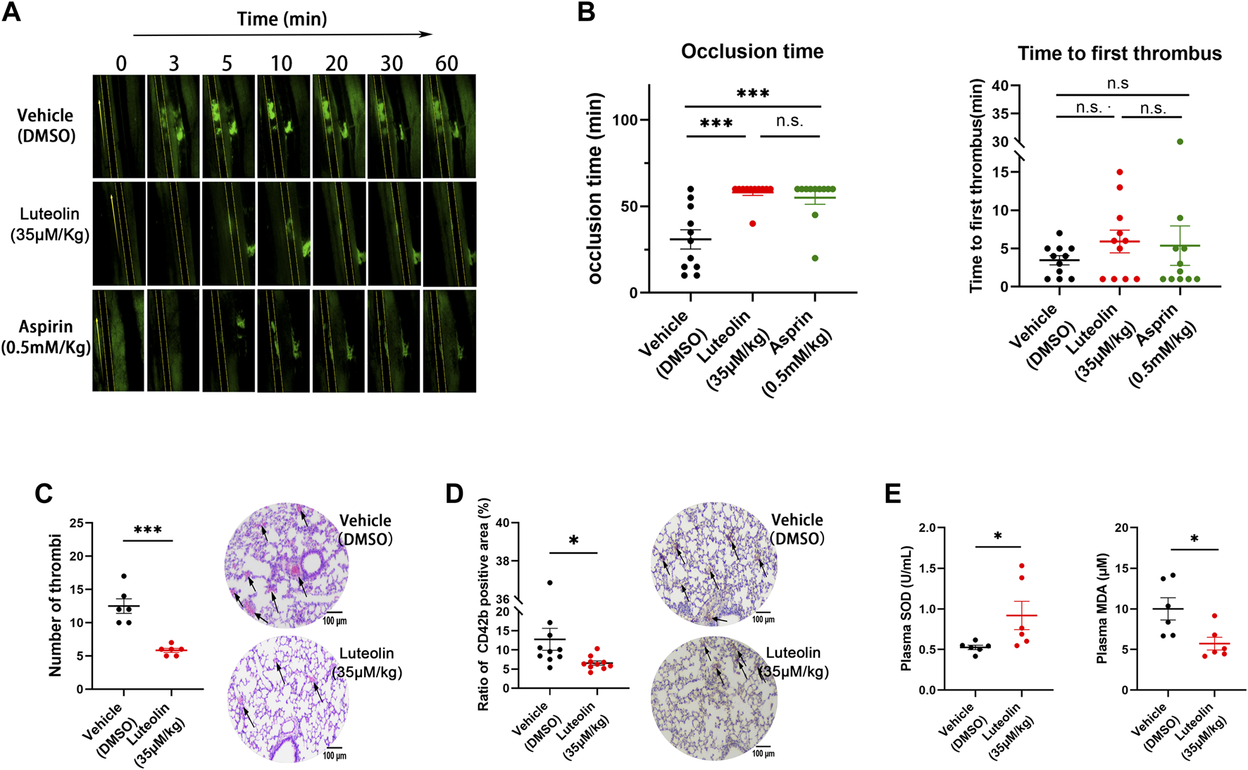 Effect of luteolin on thrombus formation and oxidative stress in vivo. (A,B) Effect of luteolin on ferric chloride-induced thrombosis in the mesenteric arteries of mice. Magnification ×4. n = 10. (C,D) Effects of luteolin on collagen and epinephrine injection induced pulmonary thrombosis in mice. H&E (C) and CD41 (D) immunohistochemical analyses were performed, and the photo-grams were magnified at ×10, with arrows indicating thrombus (n = 6). (E) Effect of luteolin suppresses on malonaldehyde (MDA) generation and superoxide dismutase (SOD) activity in plasma of pulmonary embolism mice (n = 6). Results are expressed as mean ± SEM. Differences between DMSO and luteolin groups were analyzed with unpaired t-tests to compare the differences between the two groups. One-way ANOVA followed by Dunnett’s test was applied to multiple comparisons. *p < 0.05, ***p < 0.001.