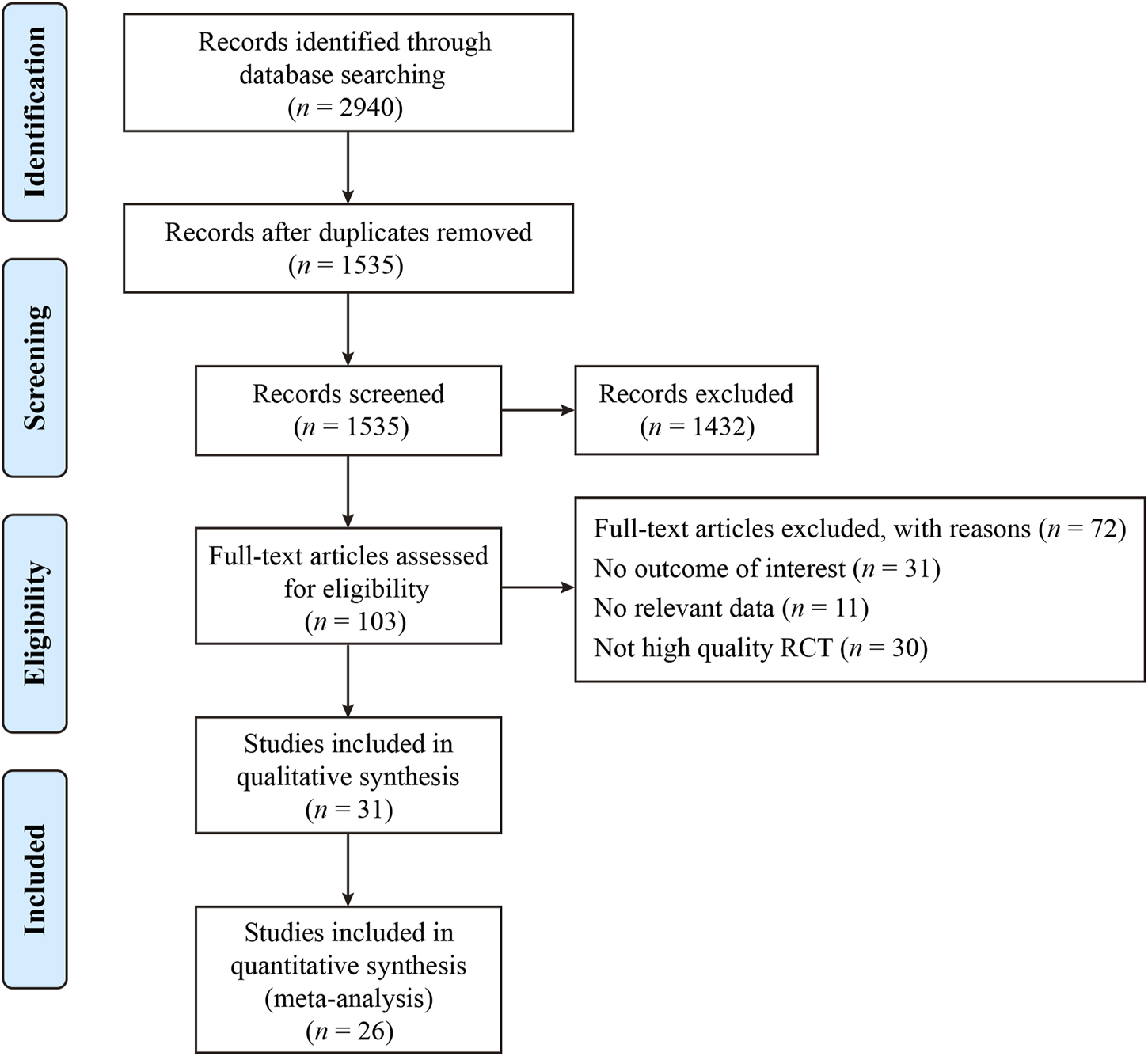 The process and results of the publication search and selection are shown in Figure 1. A total of 2,942 articles were identified, with 695 from PubMed, 1,859 from Web of Science, 94 from Google Scholar, and 294 from ScienceDirect. After removing duplicate articles, we proceeded to read the remaining 1,535 titles and abstracts. After excluding published in non-English, reviews, letters and those whose theme did not match the criteria of this study, 103 articles remained. An additional 72 articles were excluded after a full-text review based on previous protocols. Finally, 31 articles were included in this meta-analysis. The main characteristics of the 31 studies are provided in Supplementary Tables S1, S2. The bias risks for each study and overall are shown in Figure 2, Figure 3.