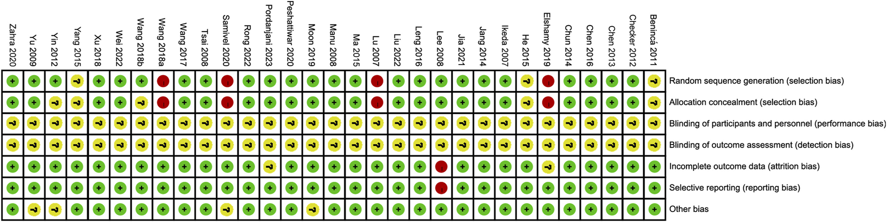 Two investigators (M.Z. and F.Y.W.) performed independent study quality assessment according to the criteria provided in the Consolidated Standards of Reporting Trials statement (Moher et al., 2015) and the Cochrane Collaboration’s tool for assessing risk of bias (Higgins et al., 2011). The assessment items included random sequence generation (selection bias), allocation concealment (selection bias), blinding of participants and personnel (performance bias), blinding of outcome assessment (detection bias), incomplete outcome data (attrition bias), selective reporting (reporting bias), and other bias. The divergences were resolved by the third investigator (Z.H.T.).
