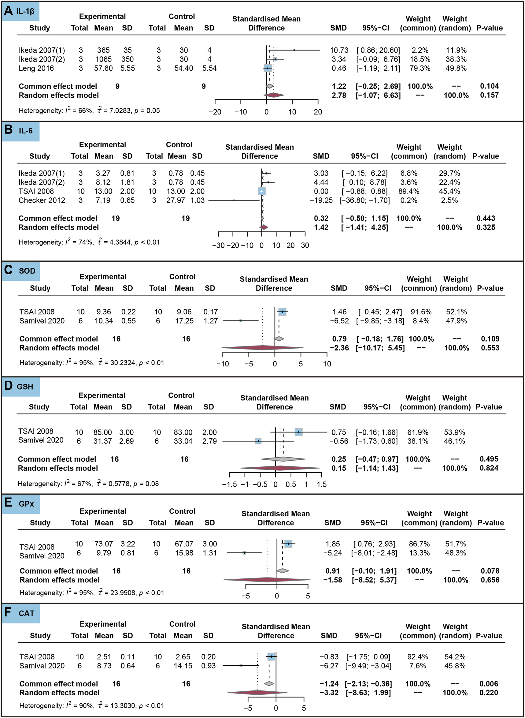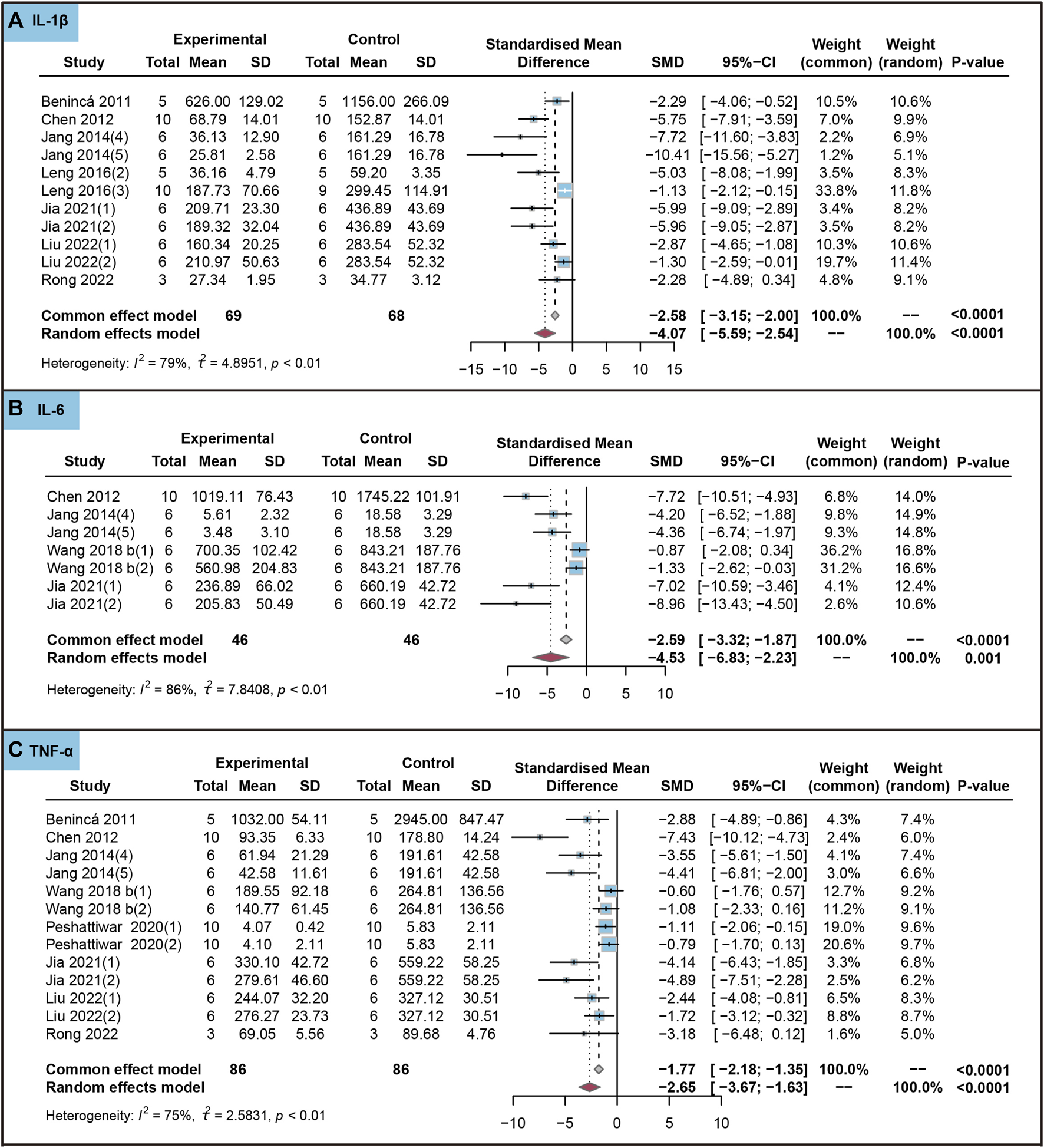 In animal studies, we analyzed the effect of the use of ursolic acid to treat chronic inflammatory and oxidative stress system lesions on inflammatory markers. As shown in Figure 4, ursolic acid significantly reduced the content of IL-1β (SMD = −4.07, 95%CI: −5.59 to −2.54, PSMD < 0.0001, I2 = 79%), IL-6 (SMD = −4.53, 95%CI: −6.83 to −2.23, PSMD < 0.0001, I2 = 86%) and TNF-α (SMD = −2.65, 95%CI: −3.67 to −1.63, PSMD < 0.0001, I2 = 75%).
