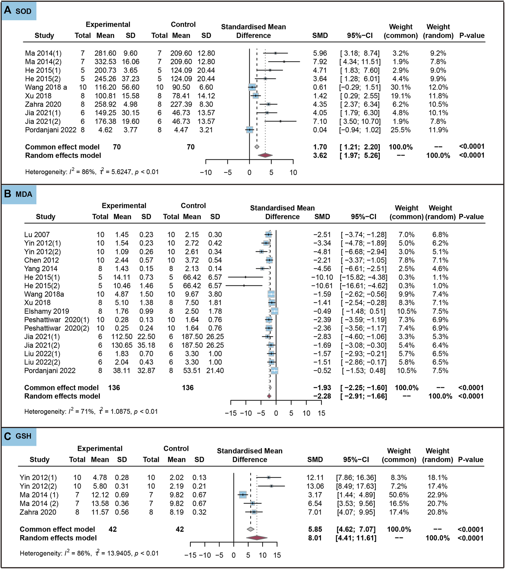 We analyzed the effects of the use of ursolic acid to treat chronic inflammatory and oxidative stress system lesions on oxidative stress markers. As shown in Figure 5, ursolic acid significantly increased the content of SOD (SMD = 3.62, 95%CI: 1.97 to 5.26, PSMD < 0.0001, I2 = 86%) and GSH (SMD = 8.01, 95%CI: 4.41 to 11.61, PSMD < 0.0001, I2 = 86%). Ursolic acid significantly reduced the content of MDA (SMD = −2.28, 95%CI: −2.91 to −1.66, PSMD < 0.0001, I2 = 71%).