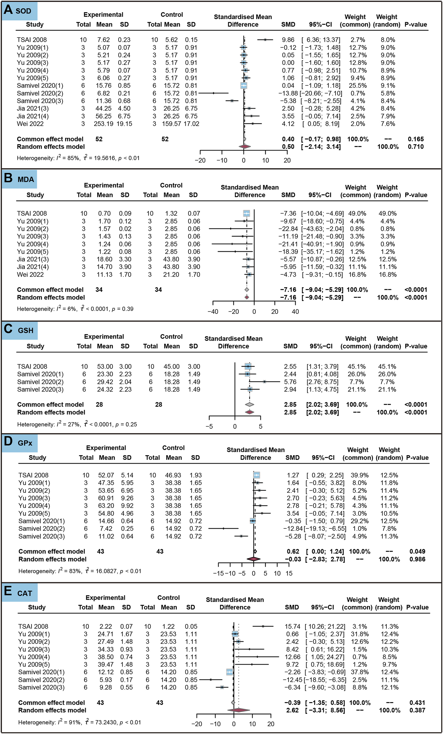 We analyzed the effects of the use of ursolic acid to treat chronic inflammatory and oxidative stress system lesions on oxidative stress markers in cells. As shown in Figure 8, ursolic acid did not significantly affect withers SOD, GPx and CAT (PSMD > 0.05). Ursolic acid significantly reduced the content of MDA (SMD = −7.16, 95%CI: −9.04 to −5.29, PSMD < 0.0001, I2 = 6%). Ursolic acid significantly increased the content of GSH (SMD = 2.85, 95%CI: 2.02 to 3.69, PSMD < 0.0001, I2 = 27%).