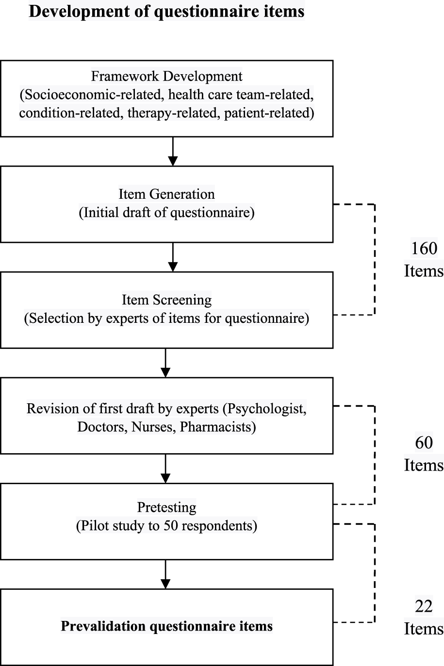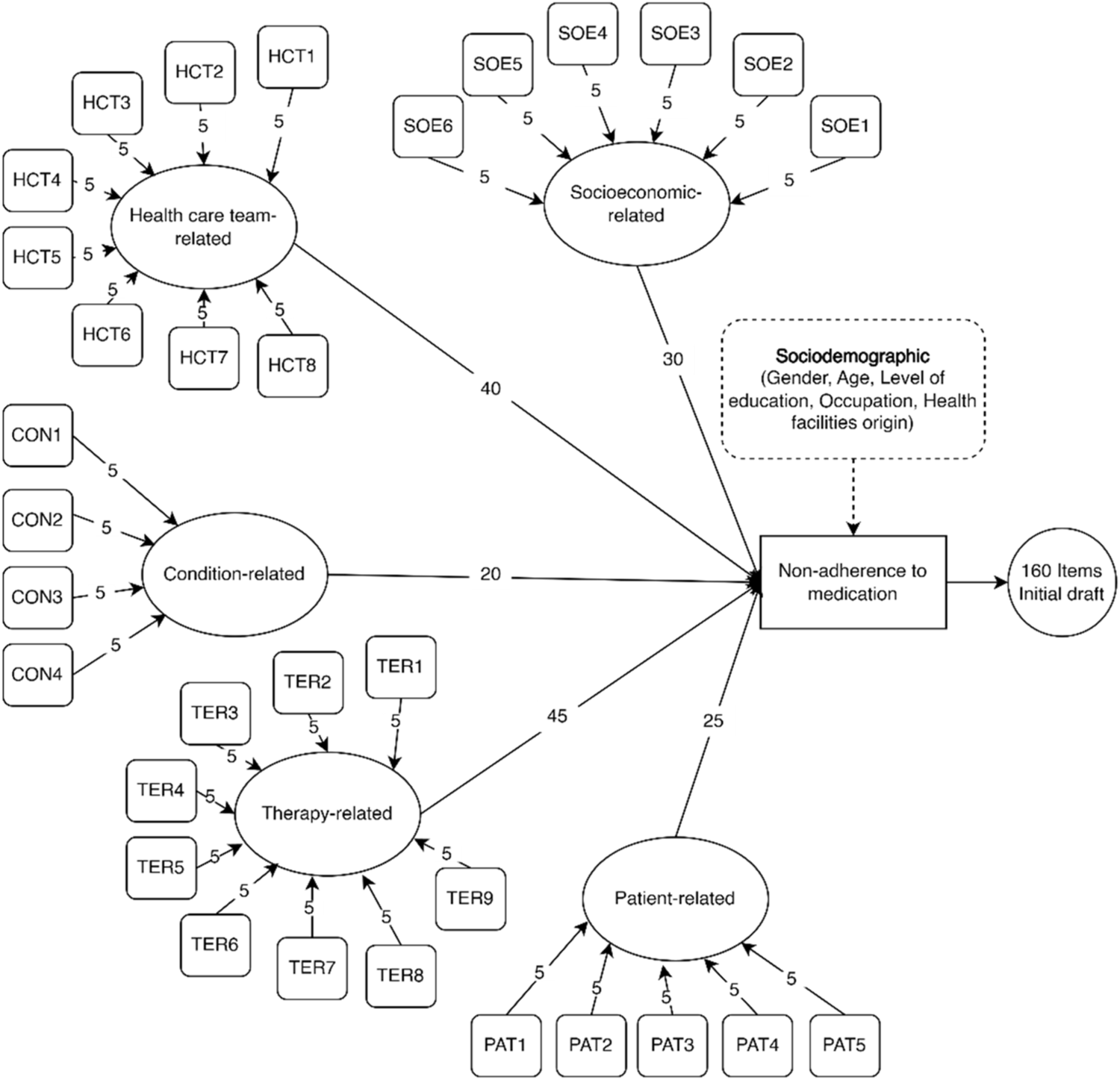 Results: In the development phase, 168 items were defined, consisting of sociodemographic characteristics (8 items) and risk factors for medication non-adherence (160 items). Expert evaluation reduced the number of items to 60, which decreased to 22 after performing a pilot study. Subsequent SEM-PLS modeling resulted in the identification of 14 valid items, representing five major risk factors, namely, socioeconomics (4 items), healthcare team (4 items), condition (3 items), therapy (2 items), and patient (1 item). Only condition-related factors were found to influence non-adherence, and all constructs showed good reliability based on Cronbach’s alpha (>0.6) and composite reliability (0.7) values.