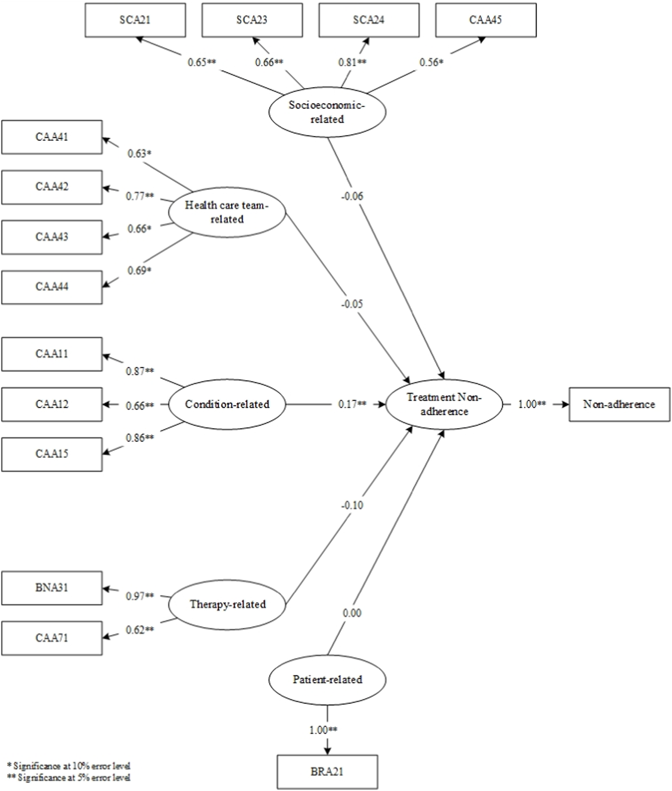 In the simulated SEM-PLS model, only one factor, namely, condition, significantly influenced non-adherence. This indicated why all condition-related factor items remained entirely valid at the analysis stage. However, the therapy-related factors had no impact on non-adherence in the SEM-PLS model. In comparison to the other four, condition-related factors significantly influenced patient non-adherence to medication.