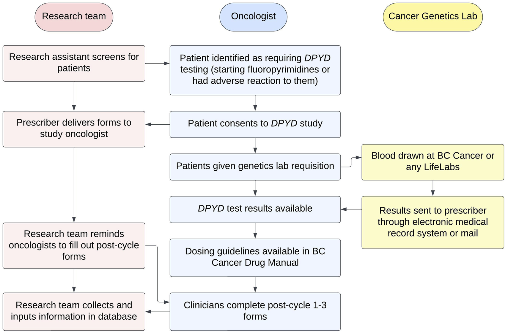 In Canada, other methods to determine DPD function such as therapeutic drug monitoring (TDM) and phenotyping have not been implemented to our knowledge. In the absence of prospective screening, physicians are blind to the necessity of dose reduction, inevitably resulting in an avoidable increase in the incidence of severe toxicity. Prior to this initiative, prospective DPYD genotyping was not routinely available in British Columbia (BC). As such, patients predisposed to fluoropyrimidine toxicity could not be identified prior to initiation of therapy, resulting in a preventable increase in morbidity and mortality.