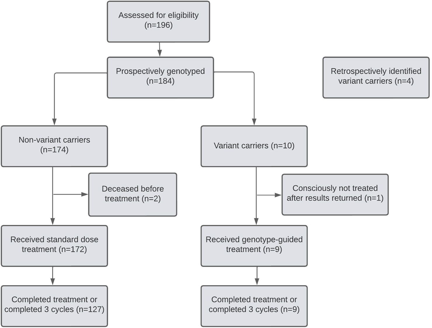 Patients’ eligibility was confirmed with oncologists before their first oncology appointment. Out of 196 patients assessed, 12 did not end up on fluoropyrimidine-based regimens and were not enrolled (Figure 2). No patient declined testing.