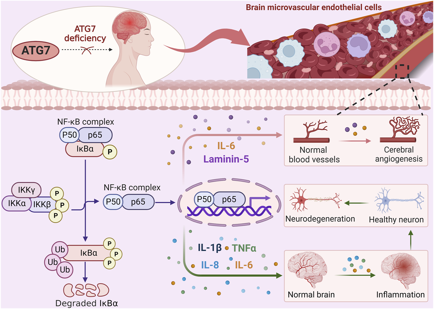 ATG7 regulates angiogenesis through NF-κB activation. ATG7 deficiency reduces IKKβ phosphorylation, thereby inhibiting IκBα phosphorylation and ubiquitination. Subsequent exposure to NF-κB nuclear localization signals is reduced, thereby attenuating the transcription and expression of reperfusion-induced pro-inflammatory cytokines such as IL-1β, TNF-α, IL-8, and IL-6, which in turn activate inflammatory responses and exacerbate brain injury. Meanwhile, the expression of IL-6 and laminin 5, which are dependent on NF-κB activation, is decreased after ATG7 knockdown, resulting in the inhibition of cerebral angiogenesis. ATG7 relies on transcriptional mechanisms independent of the autophagy pathway to regulate angiogenesis.