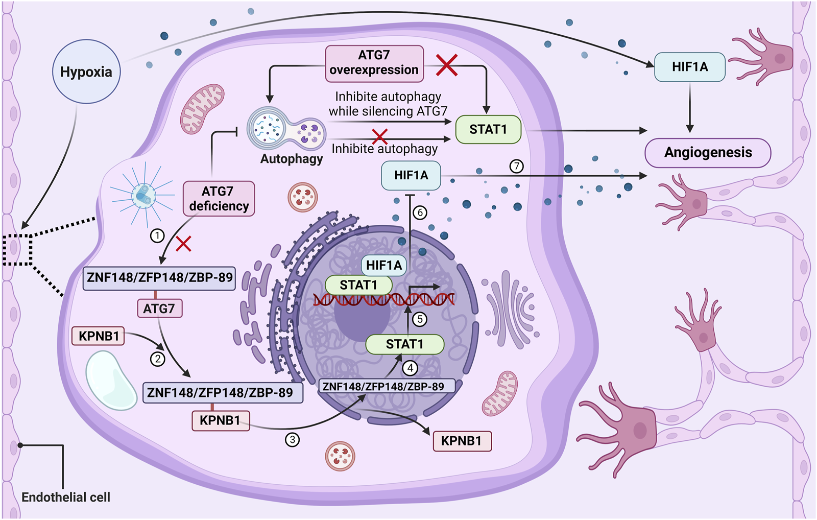 The loss of ATG7 regulates angiogenesis through STAT1 activation. ATG7 deficiency in the cytoplasm of endothelial cells will disrupt the association between ATG7 and ZNF148/ZFP148/ZBP-89. Under basal conditions, there is rarely an association between ZNF148/ZFP148/ZBP-89 and KPNB1, but the interaction between ZNF148/ZFP148/ZBP-89 and KPNB1 is significantly increased in ATG7-deficient conditions. KPNB1 transports ZNF148/ZFP148/ZBP-89 from the cytoplasm to the nucleus, resulting in ZNF148/ZFP148/ZBP-89 binding to the STAT1 gene promoter and upregulating STAT1 expression. STAT1 then binds to the HIF1A promoter and represses HIF1A expression, thereby impairing ischemia-induced angiogenesis and delaying blood flow reperfusion. Moreover, inhibition of autophagy does not affect STAT1 expression and tube formation, but silencing ATG7 while inhibiting autophagy significantly upregulates STAT1 expression and tube formation, suggesting that ATG7 deficiency upregulates STAT1 expression and inhibits blood vessel formation in an autophagy-independent manner. ATG7 overexpression activates autophagy but does not affect ZNF148/ZFP148/ZBP-89 nuclear translocation, STAT1 expression, and tube formation under both normoxic and hypoxic conditions. Lack of ATG7 inhibits angiogenesis by suppressing HIF1A expression at the transcriptional level through upregulation of STAT1 independently of autophagy under ischemic conditions.