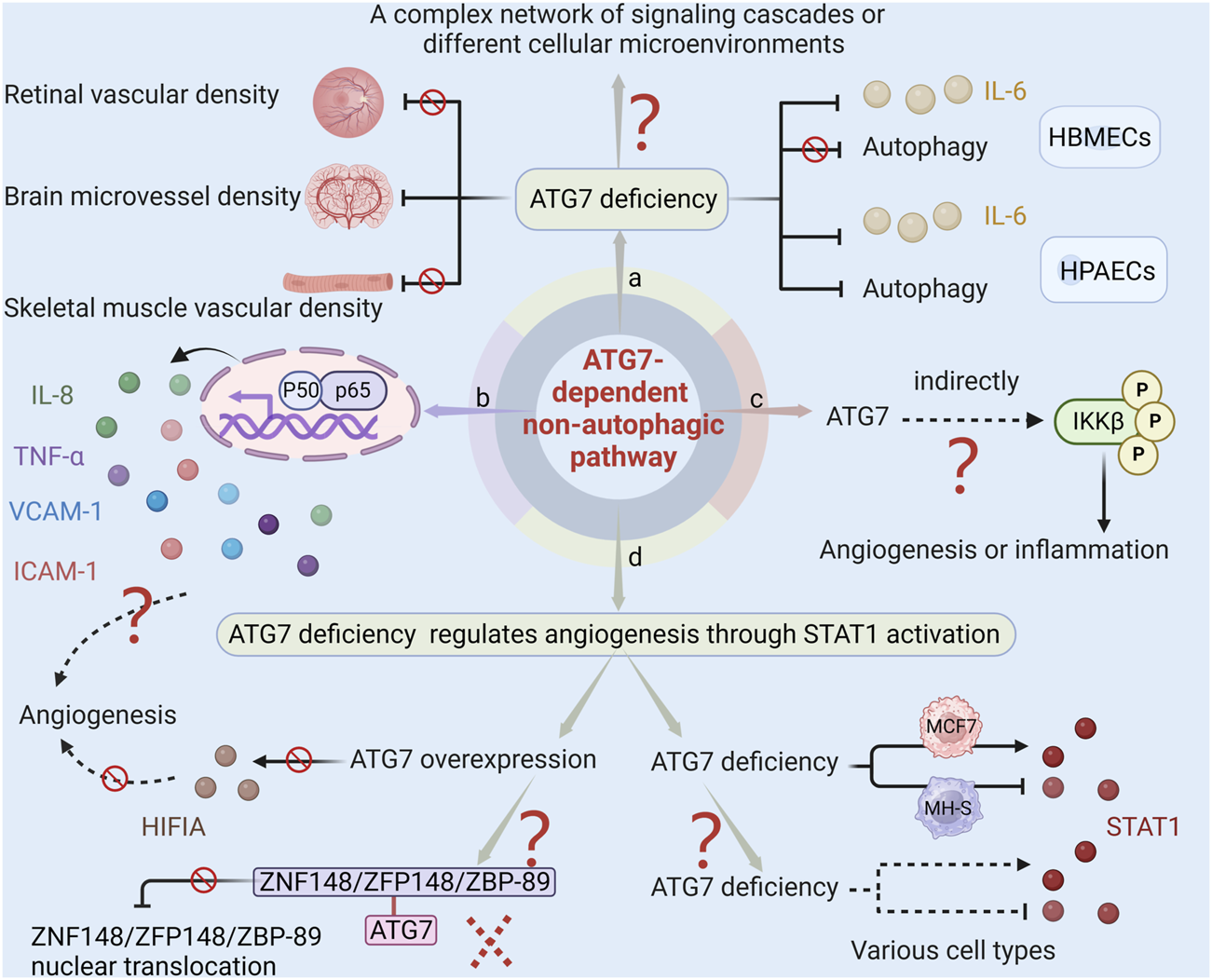 The current issues regarding ATG7-dependent non-autophagic pathway. (a) ATG7 deficiency inhibits both lipopolysaccharide-induced IL-6 production and autophagy in HPAECs. However, in HBMECs, ATG7 deficiency impacts IL-6 production without affecting the process of autophagy. Moreover, EC-specific ATG7 knockout significantly reduces brain microvessel density but does not affect skeletal muscle or retinal vascular density. These phenomena may be caused by ATG7-induced complex networks of signaling cascades or by different cellular microenvironments. (b) Given that IL-8, TNF-α, VCAM-1, and ICAM-1 in the NF-κB pathway play a role in angiogenesis, and ATG7 deletion inhibits angiogenesis by regulating NF-κB activity. It can therefore be conjectured that other cytokines may also be involved in the regulation of neovascularization by ATG7. (c) Since ATG7 lacks a kinase domain, and some protein kinases such as NIK, AKT, MEKK, COT/TPL-2, and TAK1 can phosphorylate IKK, it is speculated that ATG7 indirectly regulates the phosphorylation of IKKβ, which subsequently affects the release of inflammatory cytokines and angiogenesis. (d) There are two unanswered questions regarding the study of ATG7 deficiency activating STAT1 to regulate angiogenesis. One is that ATG7 overexpression has no significant effect on HIFIA levels and tube formation. This could be because ATG7 overexpression does not increase the association between ZNF148/ZFP148/ZBP-89 and ATG7, so it cannot reduce the nuclear translocation of ZNF148/ZFP148/ZBP-89, nor can it reduce STAT1 expression and promote HIF1A expression. The other is that ATG7 deficiency inhibits STAT1 activation in MH-S and induces STAT1 expression in MCF7. Whether the regulation of STAT1 by ATG7 in various cells is consistent with the observation that ATG7 deficiency promotes STAT1 expression in ECs remains unclear.
