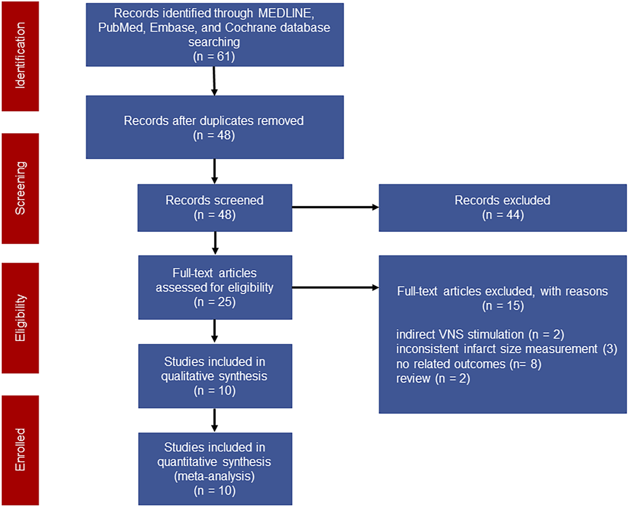 Studies were included based on the following criteria: (a) reported the infarct size measured by triphenyl tetrazolium chloride (TTC) and Evan’s blue double staining method, (b) analyzed intervention received VNS treatment merely; comparator intervention received or no treatment, (c) with no cardiovascular-related comorbidity. We excluded studies that did not express infarct size as the percentage of infarct area over the area at risk (AAR) or did not quantify the ischemic area by Evans blue/TTC staining.