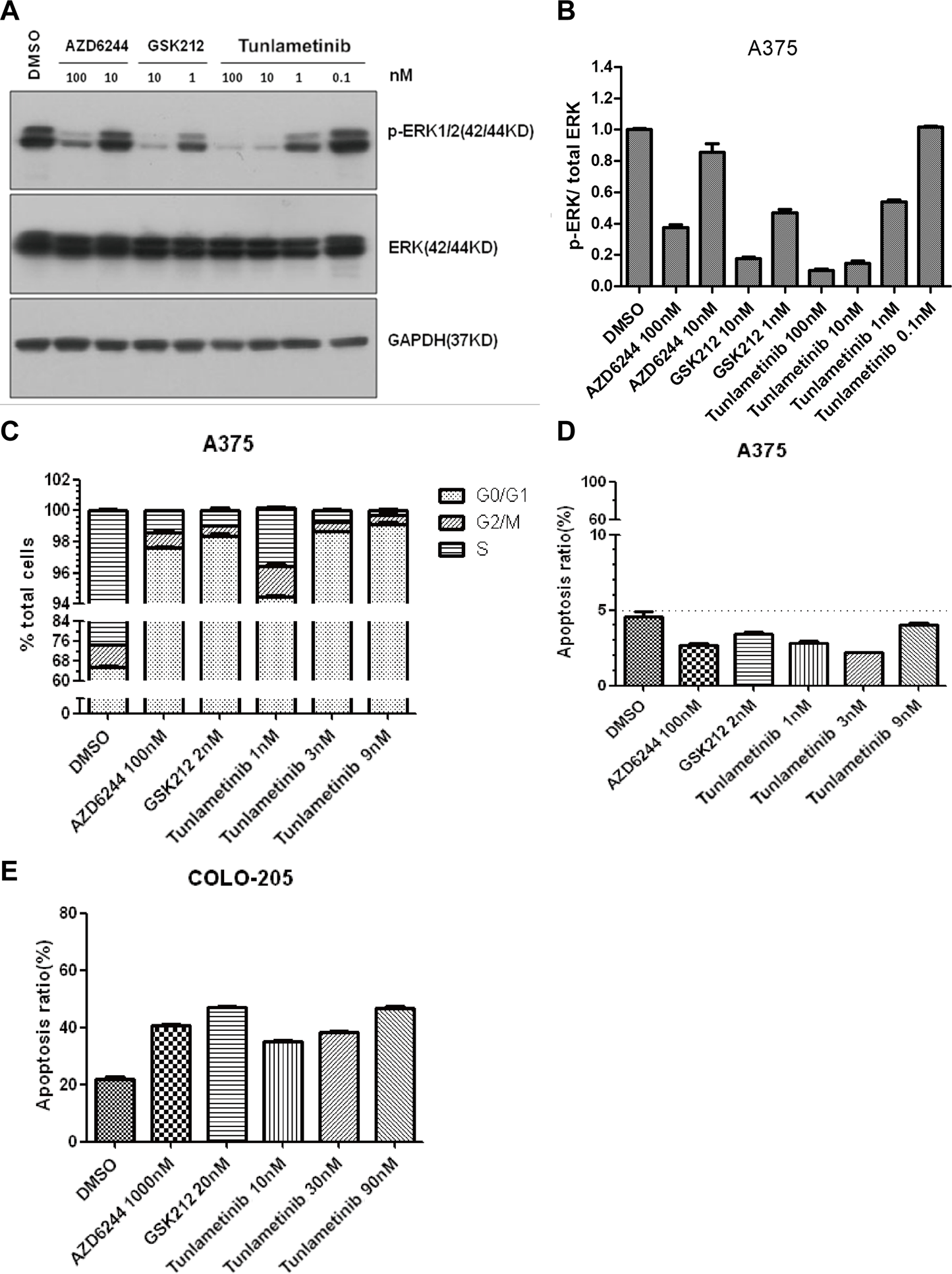 FIGURE 2. The effect of tunlametinib on p-ERK/total ERK inhibition, cell cycle and apoptosis. (A,B) The level of p-ERK/total ERK in A375 cells after treated with different concentrations of compounds. A375 cells were treated with tunlametinib at 0.1, 1, 10, 100 nM, with AZD6244 at 10, 100 nM, and with GSK212 at 1, 10 nM. (C,D) A375 cells were treated with tunlametinib at 1, 3, 9 nM, with AZD6244 at 100 nM, and GSK212 at 2 nM. (E) COLO 205 cells were treated with tunlametinib at 10, 30, 90 nM, with AZD6244 at 1000 nM, and GSK212 at 20 nM.