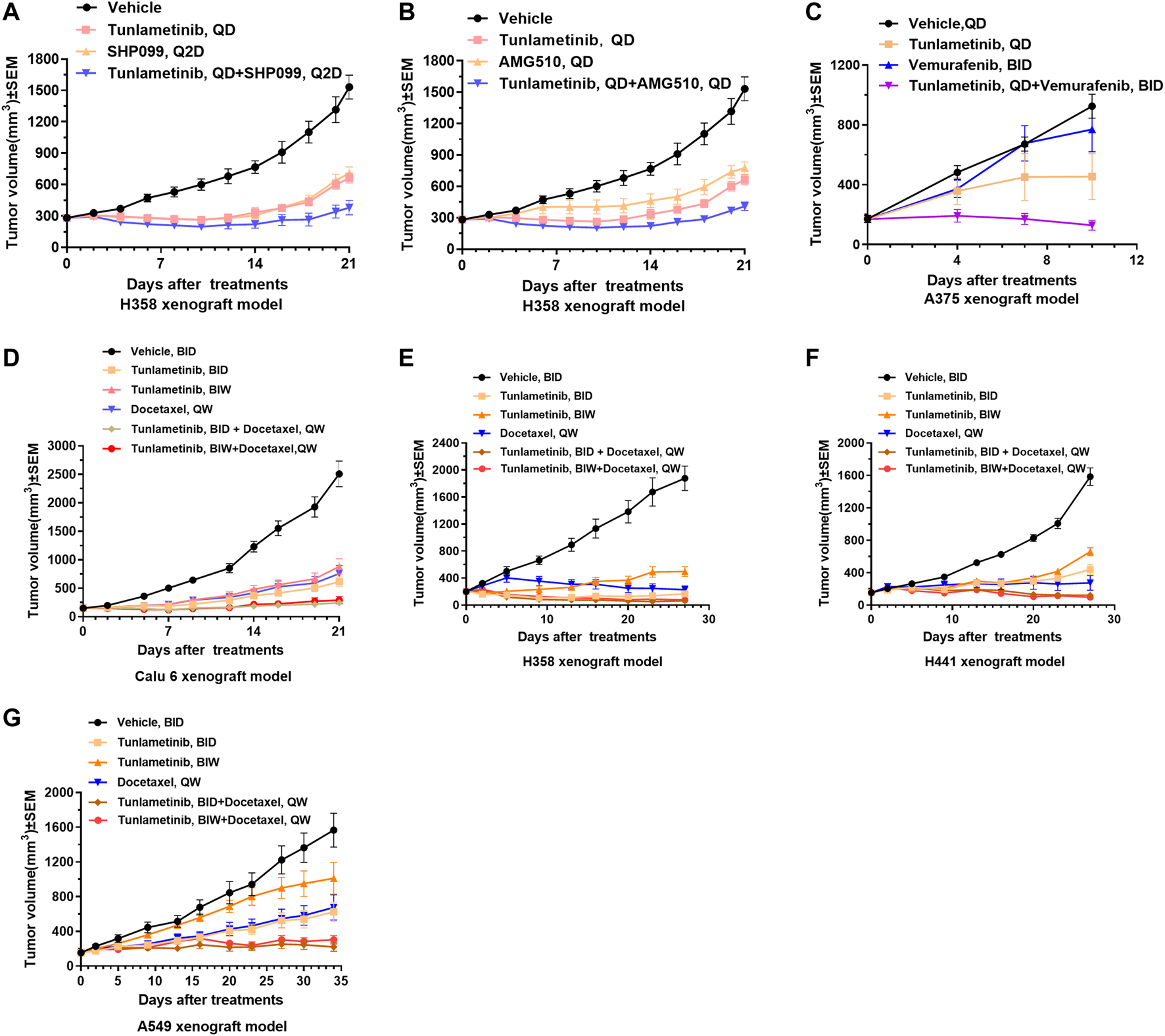 FIGURE 5. Tumor growth curves of combination treatments in cell line-derived xenografts. Tunlametinib combined with SHP2/KRASG12C/BRAF inhibitors in KRAS or BRAF mutant xenografts. (A,B) Tunlametinib (0.25 mg/kg, then decreased to 0.125 mg/kg from day 10, QD, P.O.) combined with SHP099 (50 mg/kg, then decreased to 25 mg/kg from day 10, Q2D, P.O.) or AMG510 (3 mg/kg, QD, P.O.) in H358 xenograft model (n = 8 mice per group). (C) Tunlametinib (1 mg/kg, QD, P.O.) in combination with vemurafenib (25 mg/kg, BID, P.O.) in A375 xenograft model (n = 6 mice per group). (D) Tunlametinib (0.5 mg/kg, BID or 3.5 mg/kg, BIW, P.O.) combined with docetaxel (10 mg/kg, then decreased to 7.5 mg/kg from day 8, QW, i. v.) in Calu-6 xenograft models (n = 8 per group). (E) Tunlametinib (0.5 mg/kg BID or 3.5 mg/kg BIW, P.O.) combined with docetaxel (10 mg/kg for 2 weeks, decreased to 7.5 mg/kg for 1 week, and 5 mg/kg for 1 week, QW, i. v.) in H358 xenograft models (n = 8 per group). (F) Tunlametinib (0.5 mg/kg BID or 3.5 mg/kg BIW, P.O.) combined with docetaxel (10 mg/kg for 2 weeks, then decreased to 7.5 mg/kg for 2 weeks, QW, i. v.) in H441 xenograft models (n = 8 per group). (G) Tunlametinib (0.5 mg/kg BID or 3.5 mg/kg BIW, P.O.) combined with docetaxel (10 mg/kg for 1 week, then decreased to 7.5 mg/kg for 4 weeks, QW, i. v.) in A549 xenograft models (n = 8 per group). Data were shown as mean ± SEM, *p < 0.05, **p < 0.01, ***p < 0.001, student t-test.