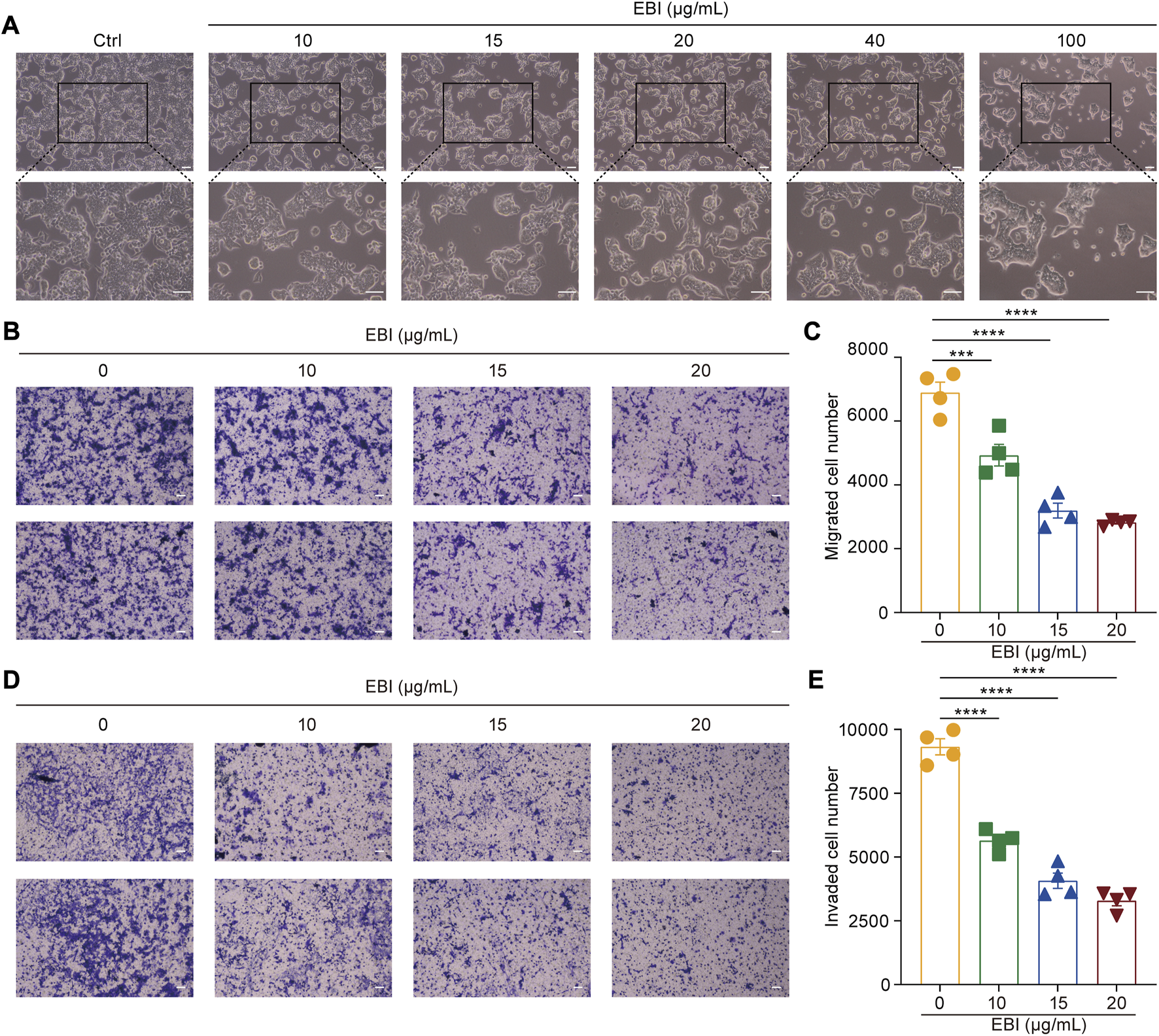 EBI suppresses growth, migration, and invasion of SW620 cells. (A) SW620 cells were observed for morphologic changes at 12 h after EBI (10, 15, 20, 40, and 100 μg/mL) treatment. Scale bars indicate 50 μm. (B, C) The representative image (B) and quantitative analysis (C) of migrated cells after exposure to EBI (10, 15, 20, and 40 μg/mL, 24 h). Scale bars indicate 50 μm. (D, E) The representative image (D) and quantitative analysis (E) of invaded cells after exposure to EBI (10, 15, 20, and 40 μg/mL, 24 h). Scale bars indicate 50 μm. Mean ± SEM. ***p < 0.001, ****p < 0.0001 vs. EBI 0 μg/mL group (one-way ANOVA).