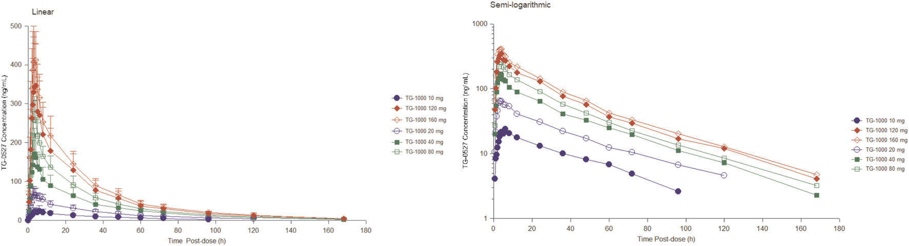 Table 2 summarizes the PK parameters of TG-0527 in each dose group following administration a single TG-1000 dose. Figure 1 demonstrates the mean plasma TG-0527 concentration-time curves.