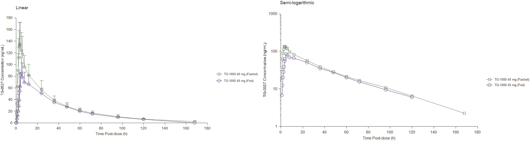 This is the first human trial of TG-1000. In the Single Ascending-Dose (SAD) study, AUC was less than the proportional increase in dose, and Cmax increased in an approximately dose-proportional manner in the 20–160 mg dose range. In the 10–160 mg dose range, T1/2, λz, and Tmax of TG-0527 are dose-independent. In the 10–160 mg dose range, Cmax and AUC implied that TG-0527 exposure increased with higher dose levels; T1/2 suggested that plasma TG-0527 elimination was consistent with a two-compartment model; and CL/F and CLR suggested that renal clearance is not the main TG-1000 elimination route and that hepatic metabolism may be the primary clearance route (hepatic extraction rate <0.3). In the Food Effect (FE) study, Tmax in both fasted and satiated conditions were consistent with those in the 40 mg dose group in Part A, suggesting a moderate absorption of TG-0527 in vivo; T1/2 suggested that the plasma TG-0527 elimination was consistent with the two-compartment model; CL/F and CLR observed in Part B were consistent with those in Part A, suggesting that hepatic metabolism may be the primary TG-0527 elimination pathway (hepatic extraction rate <0.3). Following a high-fat diet, AUC0-inf, AUC0-last, and Cmax of TG-0527 decreased by approximately 17.52%, 18.76%, and 41.35%, respectively. It is speculated that different meal spectra may have different effects on gastric physiology (such as gastric emptying time, gastric pH, etc.), and then affect the degree of drug absorption.