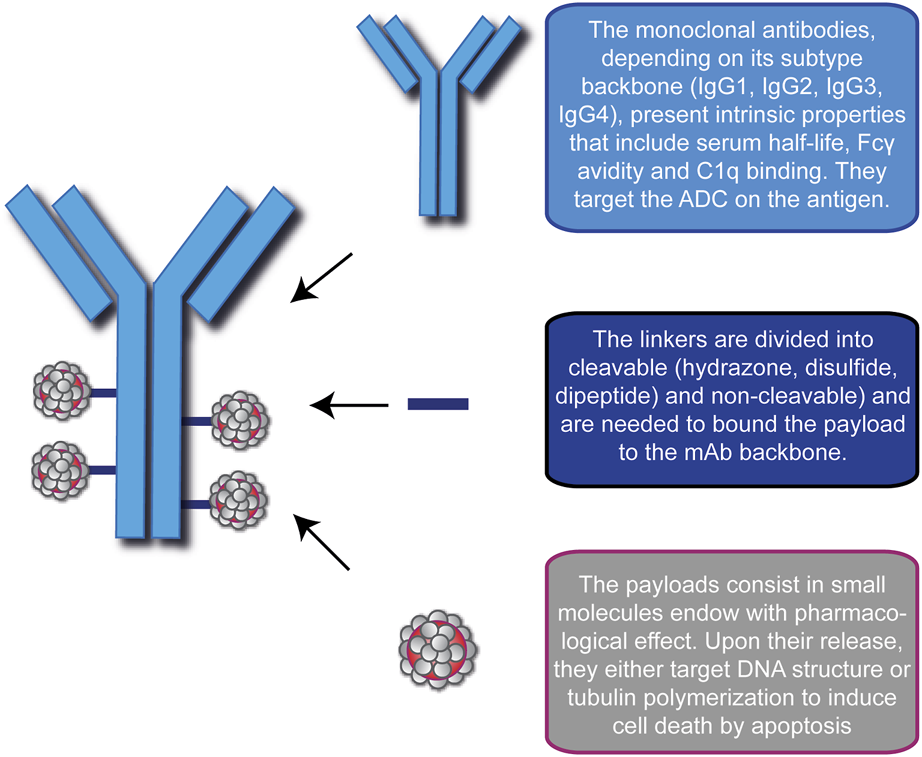An ADC is a synthetic molecule with pharmacological activity comprising three blocks: a selective mAb, a stable linker, and a potent cytotoxic drug (Figure 1). Together, they ensure tumor-specific targeting and efficient ablation of malignant cells by creating a “new” compound with enhanced therapeutic efficacy.