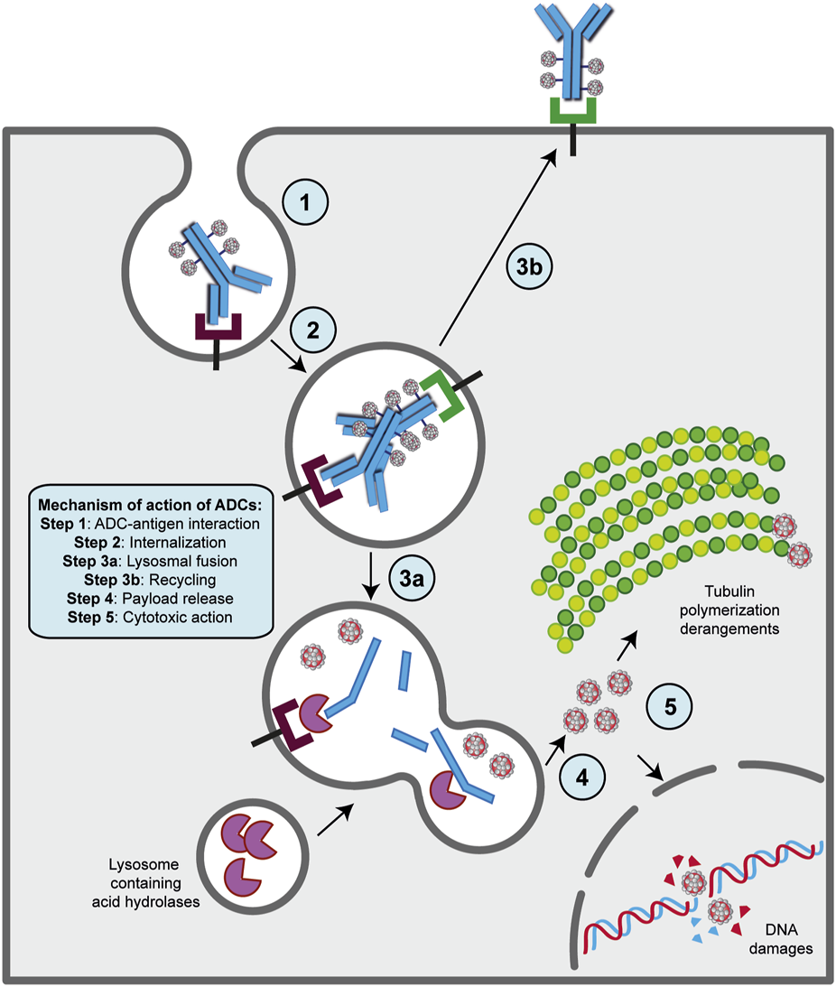 FIGURE 2. Mechanism of action of ADC strategy. The major steps of the process are indicated on the figure. Basically, following ADC-target interaction on the surface of cancer cell (step 1), this complex undergoes receptor-mediated endocytosis and enters the endosomal/lysosomal pathway until the payload is released in the cytoplasm (steps 2, 3a and 4). Then, the drug can exert its killing activity either damaging DNA structure in the nucles or derange mitotic fuse polymerization (step 5), leading to cell death by apoptosis. A fraction of ADCs binds to FcRn receptors in the early step on endosomal/lysosomal pathway and get transported out of the cell (step 2a and 3b).
