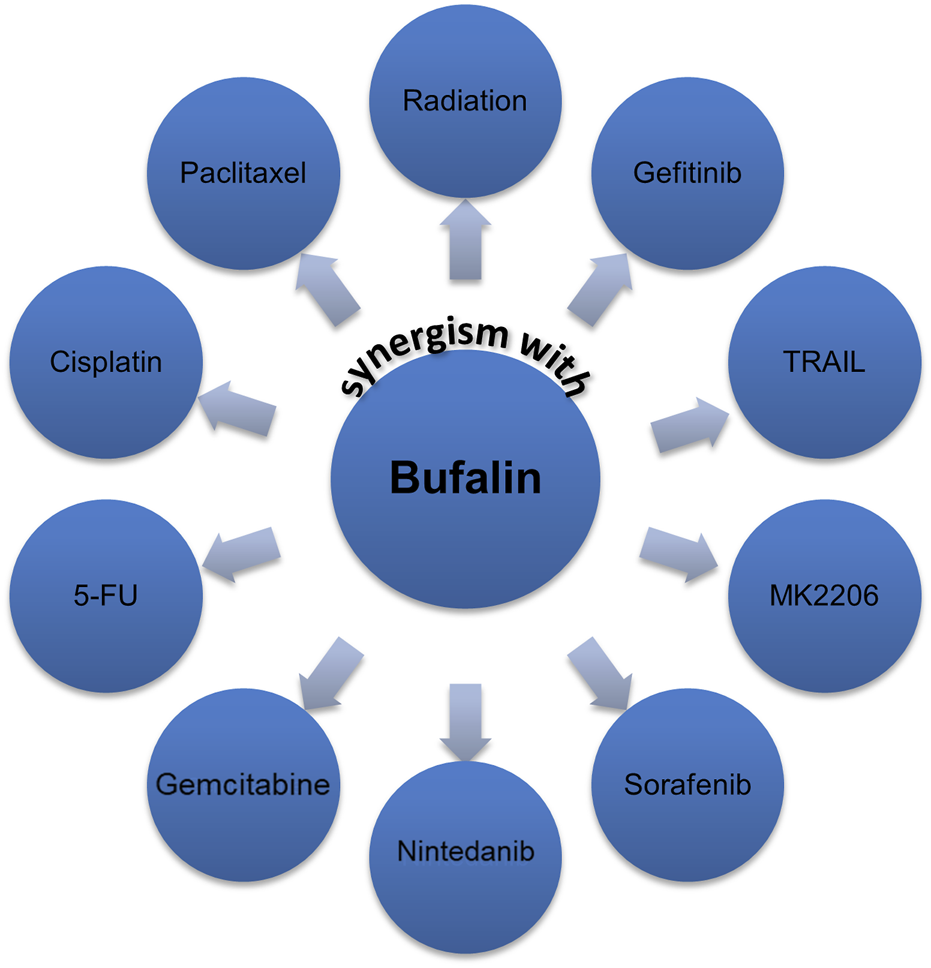As mentioned in the Introduction, bufalin is a toxic agent; thus, its role as a chemo-sensitizer other than an anticancer agent at low doses is worth trying. Four studies showed bufalin may have synergistic effects when combined with sorafenib, a TKI that targets vascular endothelial growth factor receptor (VEGFR) (Gao et al., 2012; Zhai et al., 2015; Wang et al., 2018a; Wang et al., 2018b).