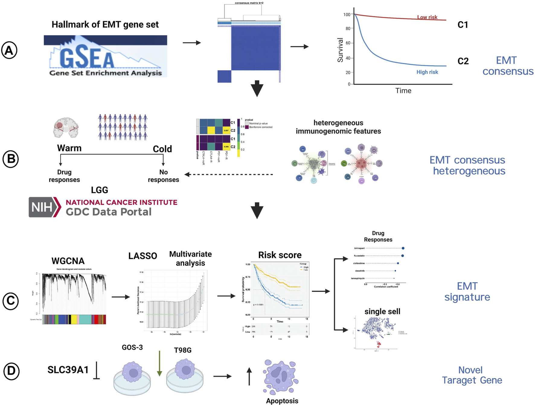 The graphical abstract and analysis flow chart of present study. (A) Construction of EMT-related consensus clusters. (B) Evaluation of immunotherapy of EMT-related consensus clusters. (C) Construction of EMT-related signature. (D) Experimental validation of SLC39A1.
