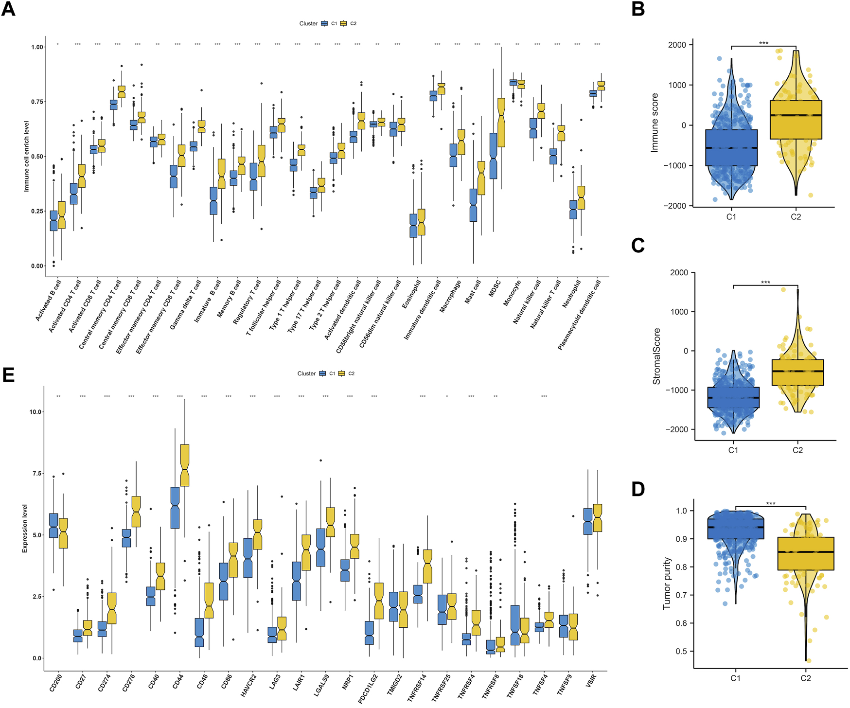Immune landscape of subtypes in LGG. (A) Comparisons of 28 immune cells infiltration level in two molecular subtypes. Evaluation of the immune score (B), stromal score (C) and tumor purity (D) in two molecular subtypes. (E) Comparisons of key immune checkpoints expression level in two molecular subtypes.