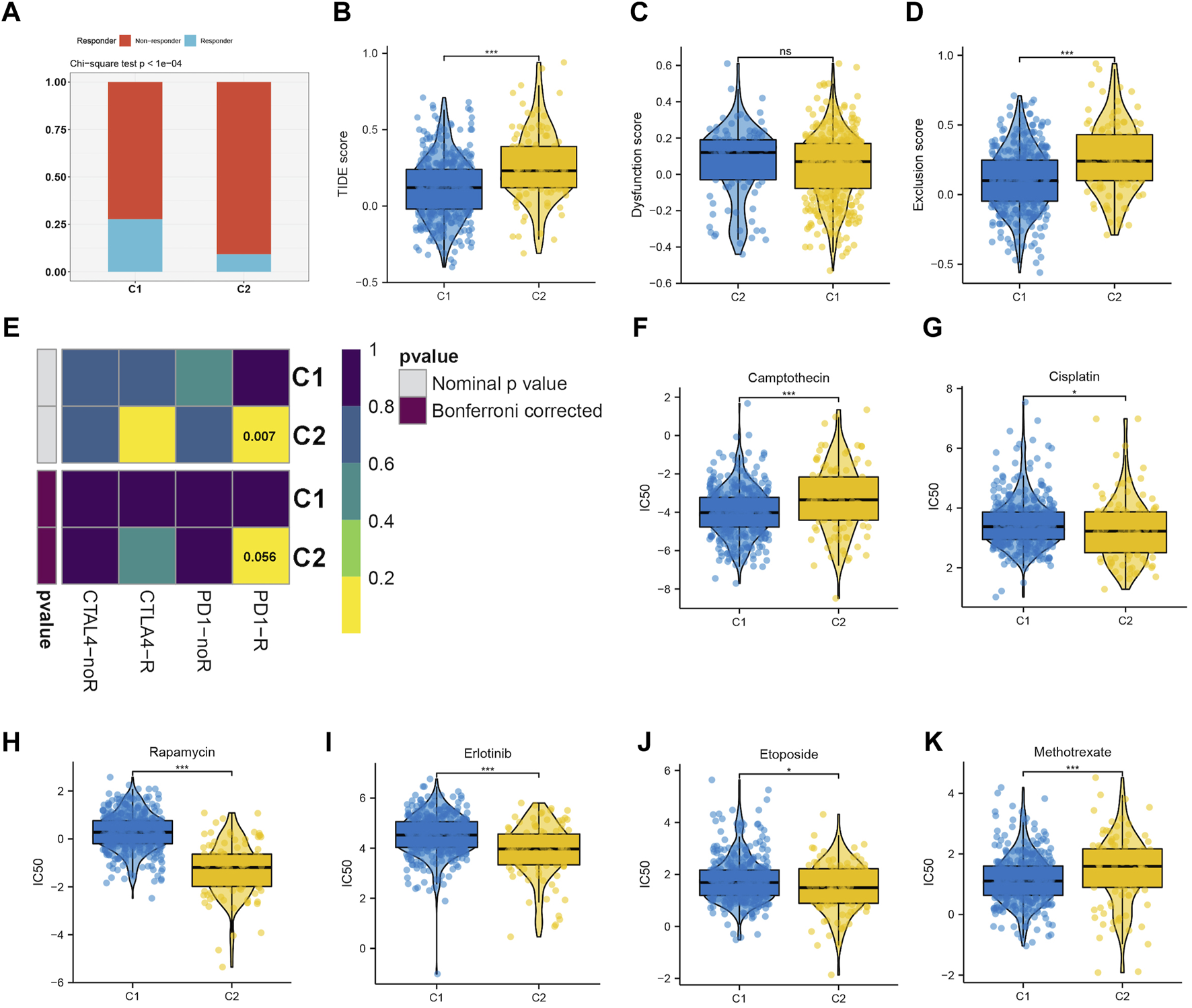 (A–D) The immune response, TIDE score, dysfunction score and exclusion score of the C1 and C2 subtype. (E) Submap analysis revealing that C2 would be more sensitive to immunotherapy, especially checkpoints PD-1 immunotherapy (Bonferroni-corrected p < 0.05). Drug sensitivity evaluation of the Camptothecin (F), Cisplatin (G), Rapamycin (H), Erlotinib (I), Etoposide (J), Methotrexate (K) in C1 and C2 subtypes.