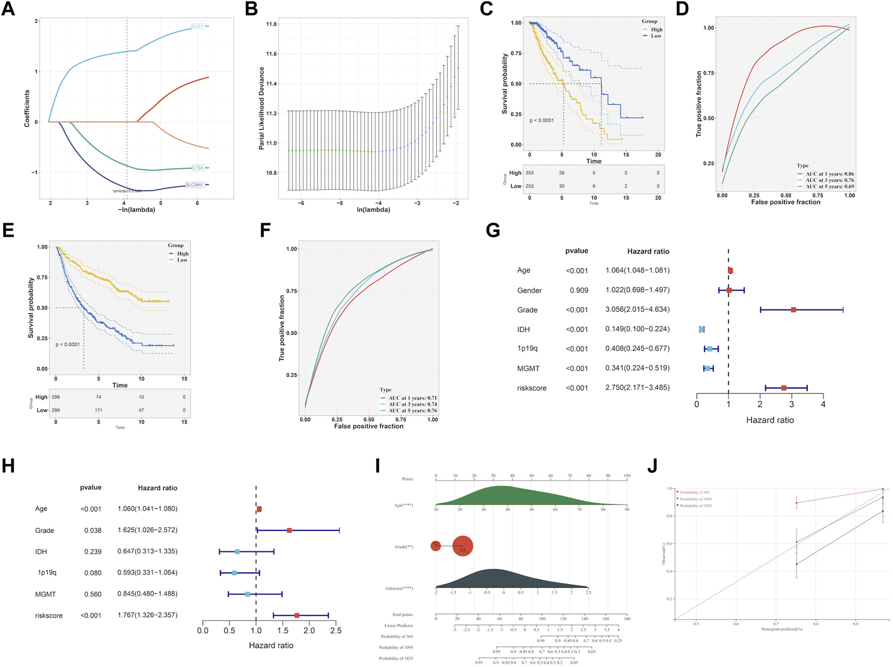 Development of EMT-related signature. (A, B) LASSO analysis to determine the EMT-related signature. (C) K-M curve survival analysis between high- and low-risk group in TCGA-LGG dataset. (D) ROC curve analysis of the EMT-related signature in TCGA-LGG dataset. (E) K-M curve survival analysis between high- and low-risk group in CGGA dataset. (F) ROC curve analysis of the of EMT-related signature in CGGA dataset. Determination of the independence of Univariate cox regression (G) and multivariate cox regression (H) analysis of the EMT-related signature. (I) Construction of nomogram on the basis of independent prognostic factors. (J) Calibration plot for the nomogram in 1-year, 3-year and 5-year OS.