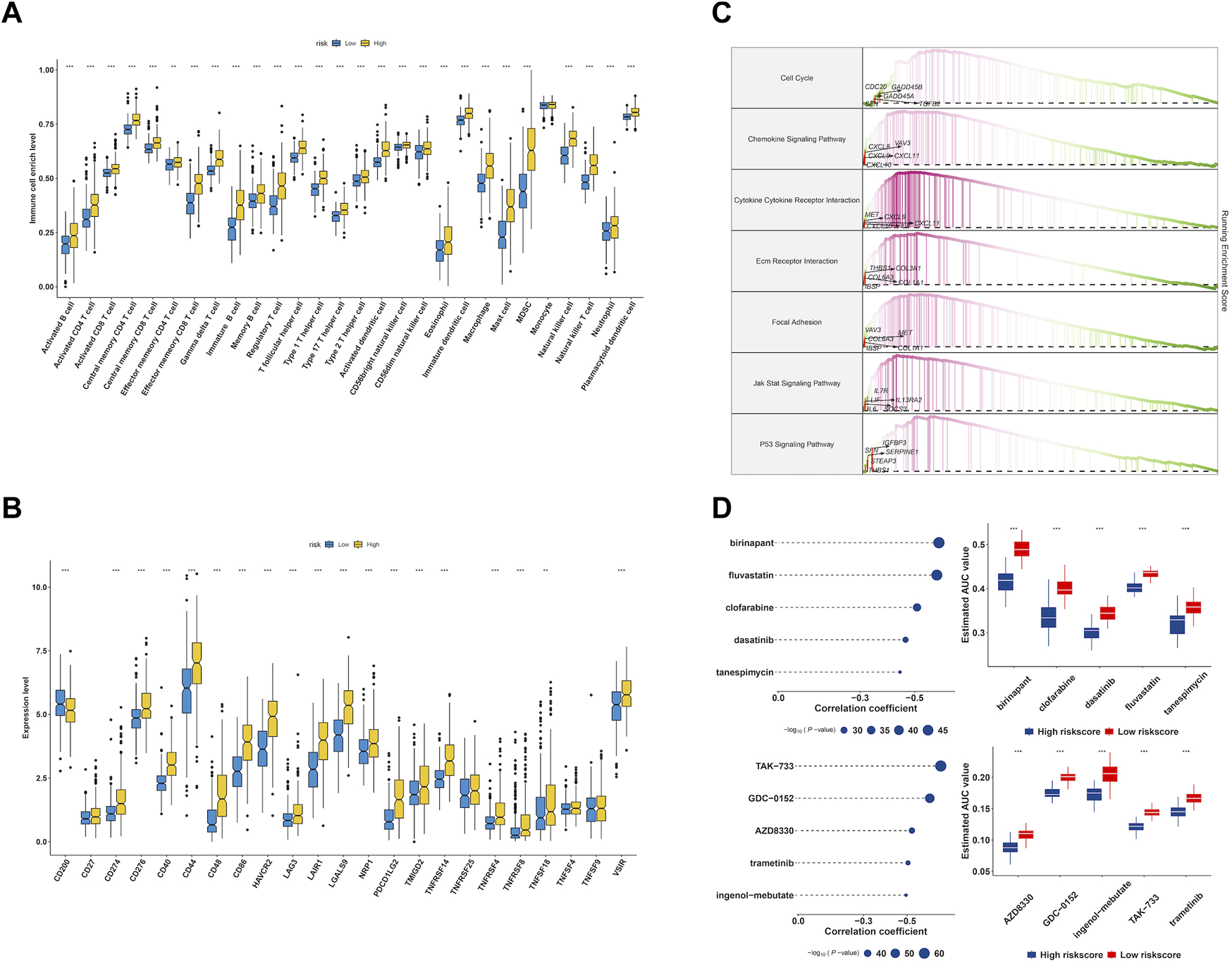 Though the immune cell infiltration analysis, we evaluated the divergence of immune cells between risk groups. The result of Figure 9A revealed that most of immune cells infiltration level in high risk group were elevated compared to low risk group, such as Activated CD8+ T cells (CD8+ Ta), effector memory CD4+ T cells, Regulatory T cells, CD56bright natural Killer cells, Type-1 T-helper 1 cells, Central memory CD4+ T cells, Activated Dendritic cells, Activated CD4+ T cells, CD56dim natural killer cells, myeloid-derived suppressor cells, Immature Dendritic cells, Central memory CD8+ T cells, Effector memory CD8+ T cells, immature B cells, macrophages, mast cells, memory B cells, natural killer cells, natural killer T cells, neutrophils, plasmacytoid dendritic cells, follicular helper T cells, Gamma delta T cells, Type-17 T helper cells, Type-2 T helper cells, activated B cells, eosinophils and monocytes. We further checked the expression of immune checkpoint between groups and found that the genes showed a high expression level in high risk group (Figure 9B). Accumulative evidence have demonstrated that anti-tumor effects of a high T cell infiltration are counteracted by the immunosuppressive pathways that are triggered by the over-expression of immune checkpoint proteins (Vuong et al., 2019; Dionellis et al., 2021). The GSEA analysis was performed between groups, and found cell cycle, chemokine signaling pathway, cytokine-cytokine receptor interaction, ECM receptor interaction, p53 signaling pathway were significantly enriched in high risk group (Figure 9C).