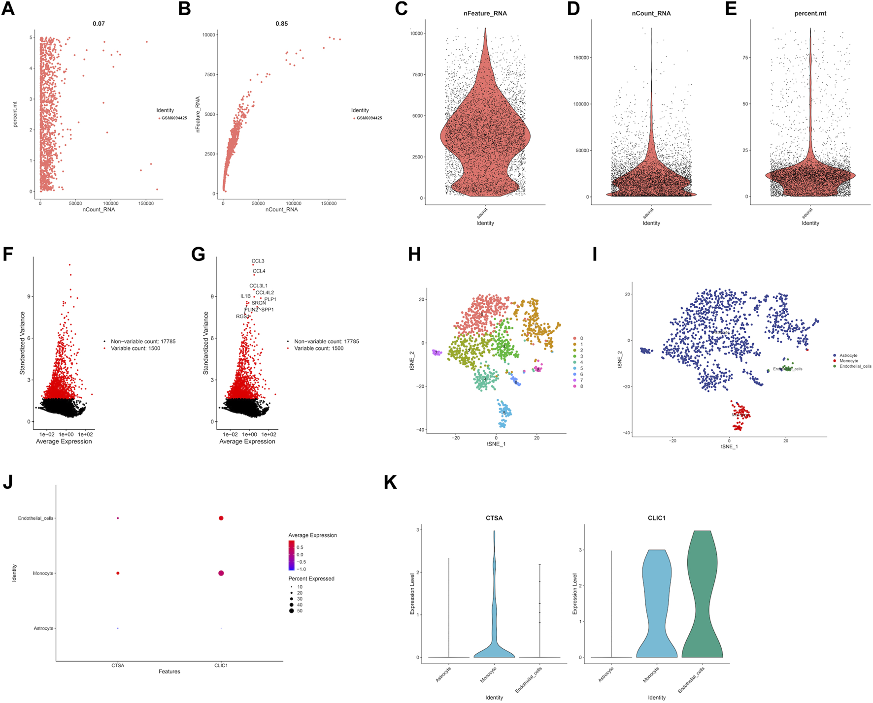 Single cell RNA analysis of LGG samples. (A) Evaluation of relationship between percentage of mitochondrial genes and mRNA readings. (B) Evaluation of relationship between percentage of mRNA quantity and mRNA readings. (C–E) A scatter plot illustrates the quantity of genes, UMI, and the percentage of mitochondrial genes in each cell type from the single LGG sample before quality control. (F–G) The red dots show the 1,500 genes that have the highest variability. (H) tSNE plot showed the cell population of LGG samples. (I) Cell annotation using cell markers for each cell. Expression level of prognostic genes in each cell type through dot plot (J) and violine plot (K).