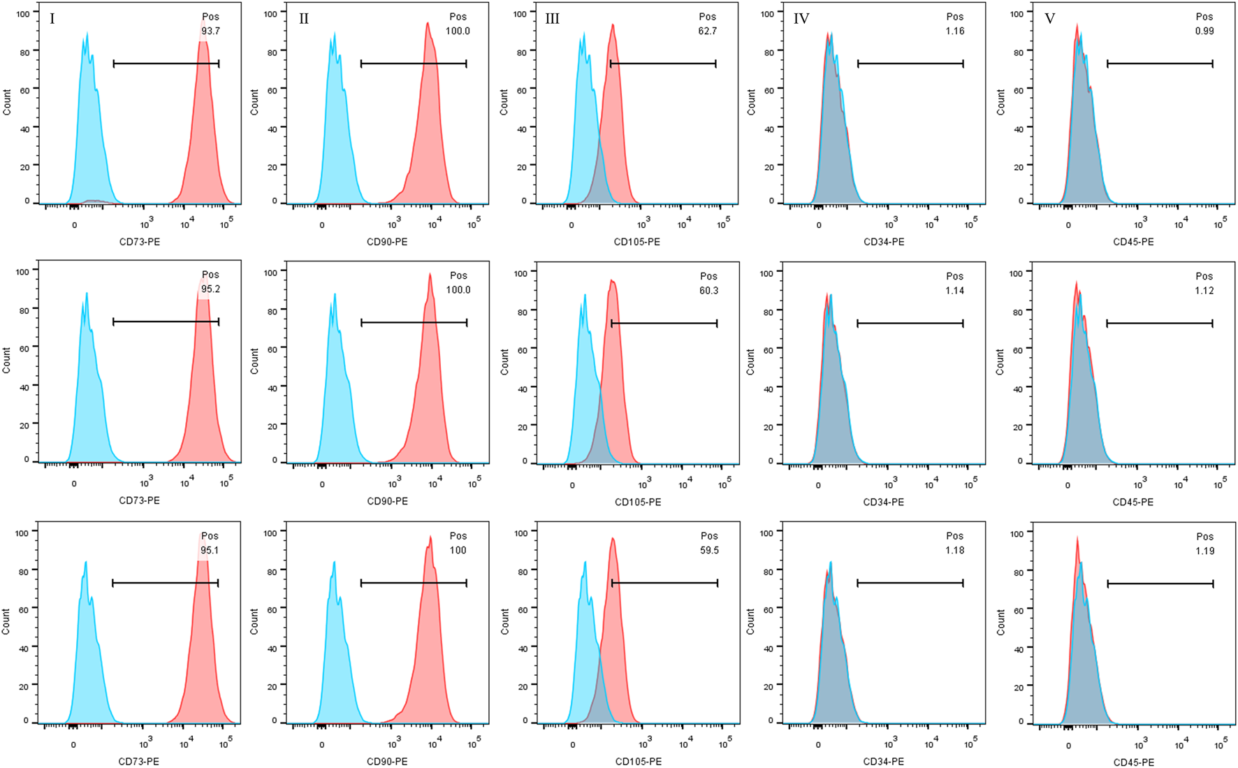 CD34, CD45, CD73, CD90 and CD105 were selected and detected as specific markers before experiments. The surface antigen expression of the three groups of samples were: CD34: (94.67 ± 0.8386) %, CD45: (100.0 ± 0.000) %, CD73: (60.83 ± 1.665) %, CD90: (1.160 ± 0.02000) % and CD105: (1.100 ± 0.1015) %. CD73, CD90 and CD105 were abundantly expressed, while CD34 and CD45 were not. (Figure 1).